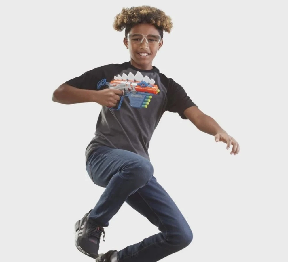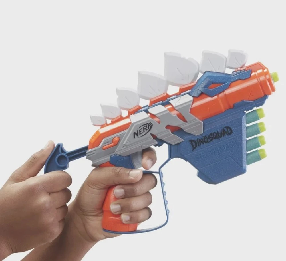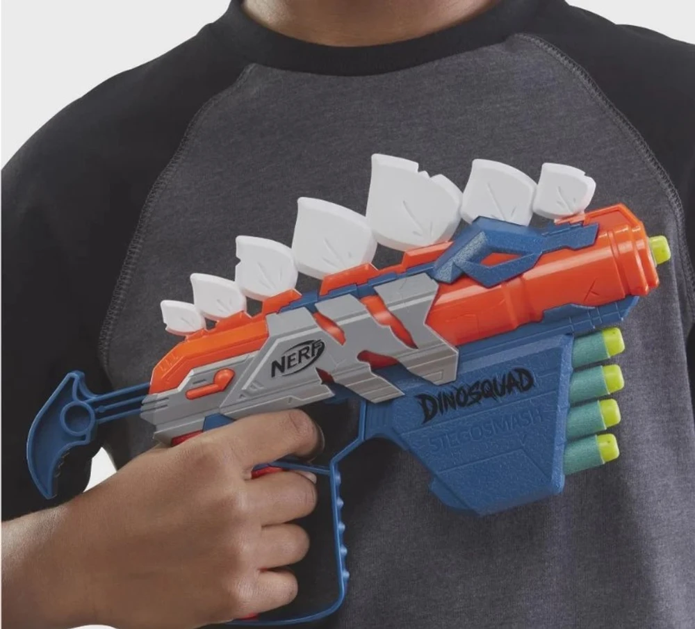 Lançador nerf dinosquad stego-smash: Ação jurássica com este lançador de dardos com detalhes de dinossauro, como um estegossauro;