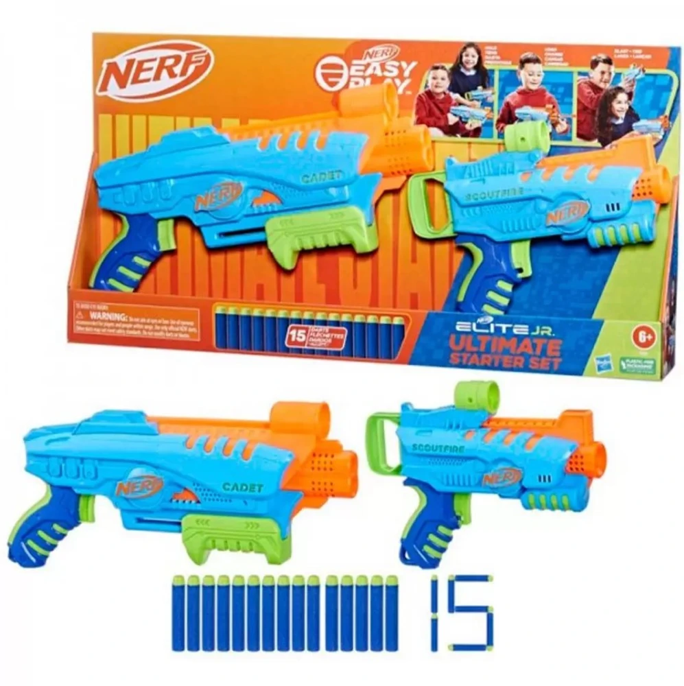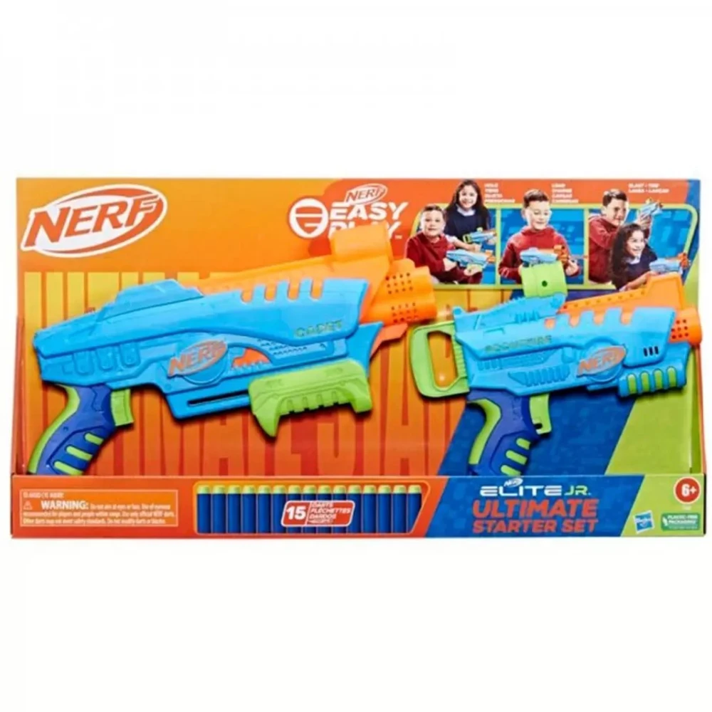 Lançadores de Dardos - Nerf Elite Jr. - Ultimate Starter Set - Hasbro : Os lançadores do kit Nerf Elite Junior Ultimate Starter Set para meninos e meninas possuem design fácil de brincar para que as crianças se divirtam em aventuras dentro e fora de casa. Os lançadores foram feitos para caber confortavelmente em mãos pequenas. São leves e podem ser segurados facilmente pelas crianças. O Nerf Elite Junior Ultimate Starter Set é um ótimo presente e inclui 2 lançadores Nerf fáceis de usar com miras grandes e 15 dardos Nerf Elite. É uma ótima maneira de exercitar as crianças em brincadeiras dentro e fora de casa que encorajam a atividade física e a interação social.Informações:? Produto: Lançadores Ultimate Starter Set? Coleção: Nerf Elite Jr.? Marca: Hasbro? Tipo: Lançador de Dardos de Espuma? Categoria: Lançadores Infantis ? Conteúdo: 02 Lançadores e 15 dardos? Recomendação: para crianças a partir de 06 anos de idadeEspecificações:? Referência: F6369? Código de Barras: 195166222677? Embalagem (C x A x L): 56 x 28 x 07 cm? Embalagem (Peso): 0.845 kg? Material / Composição: Plástico? Registro: 003832/2021 ? Certificado: Órgãos Autorizados - OCP ?S (Organismos de Certificação de Produtos)Benefícios de brincar:? Eleva a autoestima? Exercita a memória? Estimula o raciocínio? Exercita o imaginário? Desenvolve a criatividade? Desenvolve percepção visual? Desperta a atenção e curiosidade? Desenvolvimento neuropsicológico? Estimula habilidades motoras básicas? Incentiva a comunicação e linguagem? Desenvolve aspectos emocionais e afetivo? Estimula o reconhecimento de formas e coresAviso: ? As imagens são meramente ilustrativas? Os pesos, tamanhos e medidas são aproximados? As cores e estampas dos produtos podem ter variações? As informações são de responsabilidade do fabricante