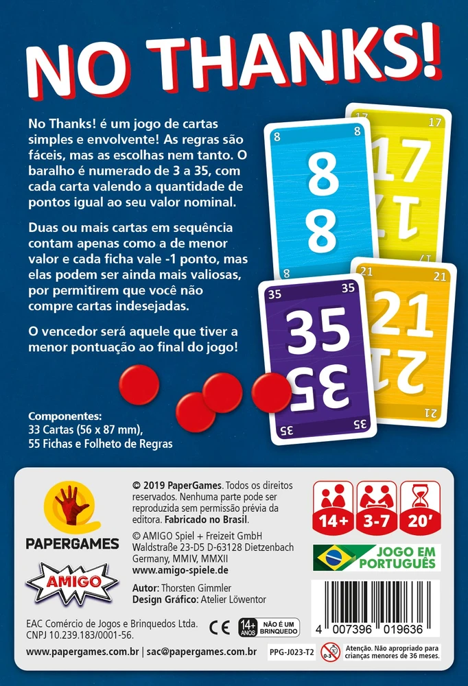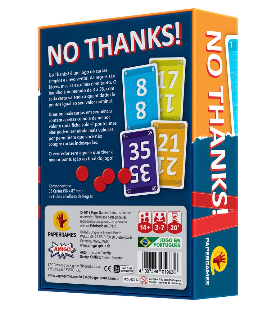 No Thanks! é um jogo de cartas simples e envolvente! As regras são fáceis. Em sua vez, os jogadores têm duas opções: