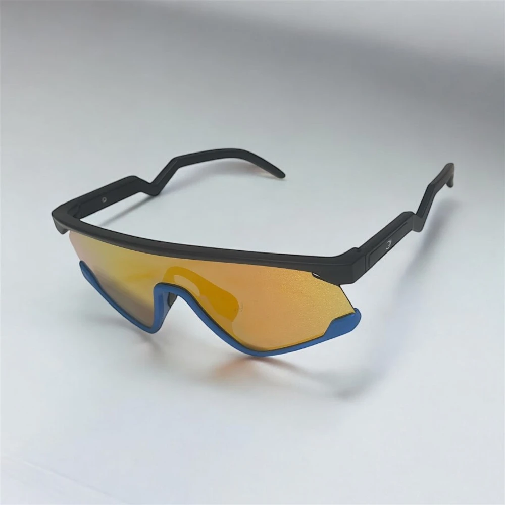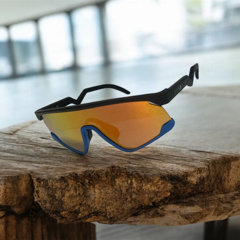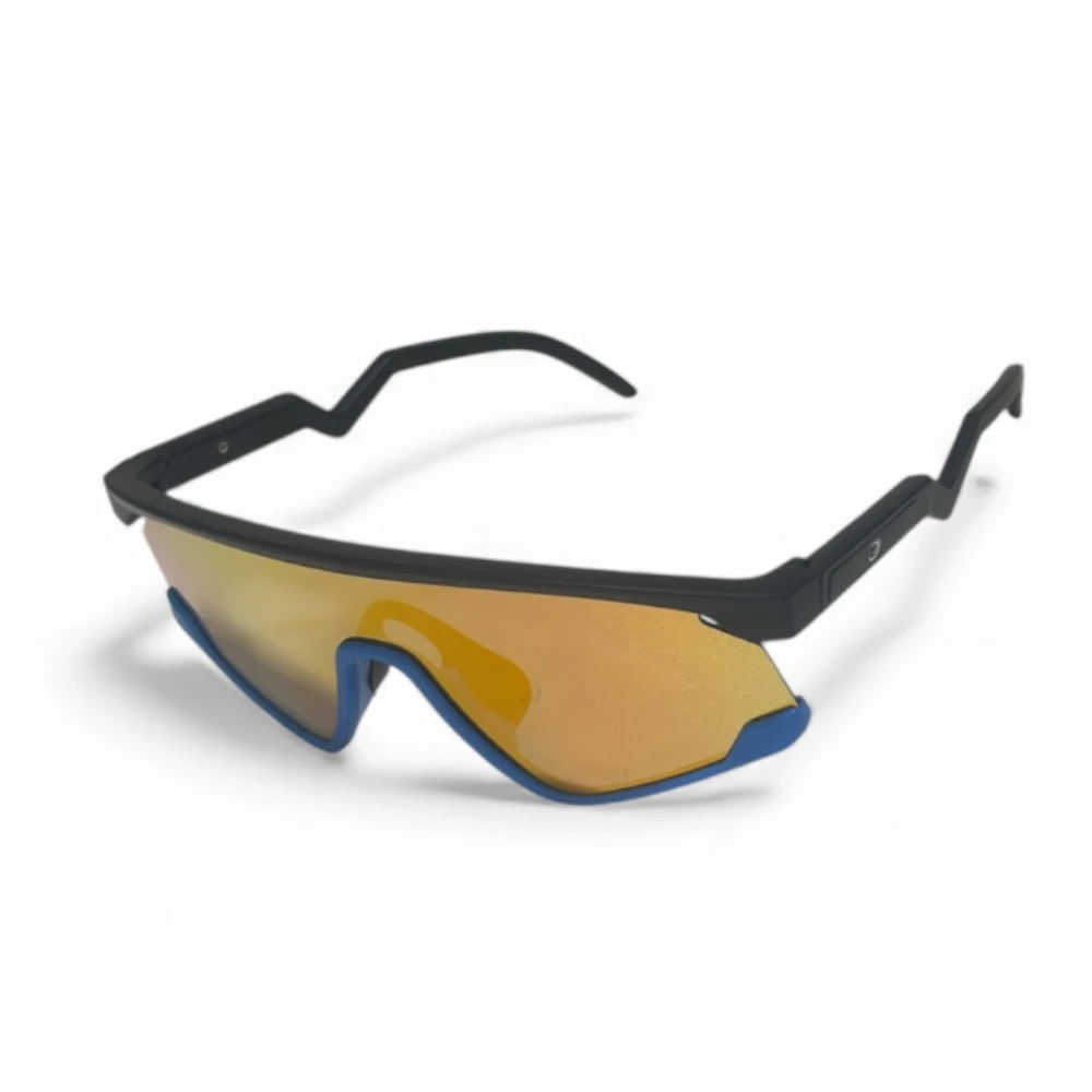 Óculos de Sol Esportivo para Corrida, Bike, MTB e Beach Tennis com lentes espelhadas laranja dourado e detalhes em azul. Projetado para máxima performance, oferece proteção UV 100% contra raios solares e alta resistência a impactos, ideal para esportes ao ar livre. O design ergonômico e leve garante conforto e ajuste seguro durante atividades intensas, reduzindo o contato com suor e vento. As hastes com formato exclusivo proporcionam estabilidade extra, mantendo o foco no seu desempenho. Invista em um acessório que une estilo moderno e funcionalidade para seu treino diário. Garanta já seu óculos esportivo e eleve sua performance com proteção e visual arrojado!