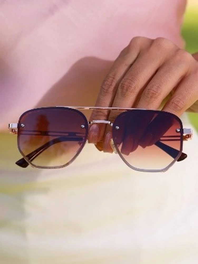 Óculos de Sol Hexagonal Bawlgriff Lentes Marrom degradê rosê em metal anticorrosivo premium. Modelos unissex com acabamento luxo.