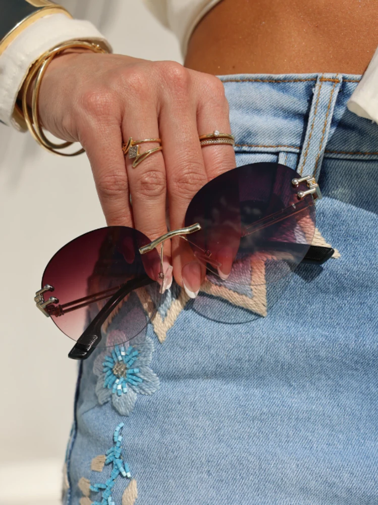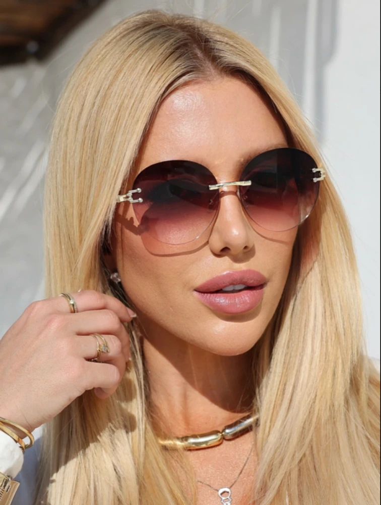 Apresenta um design sem armação (rimless), o que significa que suas lentes são sustentadas diretamente pelas hastes, proporcionando um visual leve, minimalista e contemporâneo. Essa característica destaca seu rosto e oferece uma sensação de leveza incomparável.