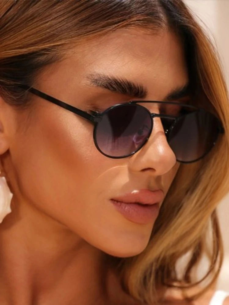 O New Gold é aquele óculos que vai fazer você se sentir poderosa! Com seu formato oval super elegante e armação em metal preto, ele traz aquela vibe sofisticada e moderna que toda mulher merece. A lente preta degradê é puro charme - escura no topo e mais clara embaixo, criando um visual contemporâneo e versátil que combina com tudo.