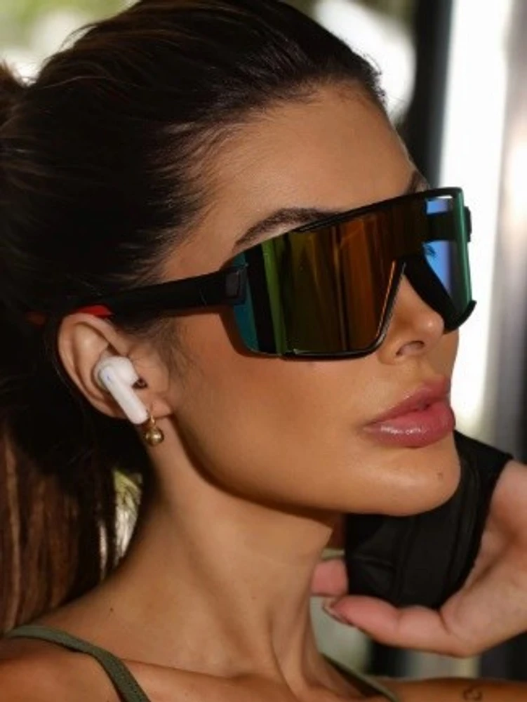 O Vortex C4 é para quem não tem medo de se destacar! Com armação preta fosca, lente azul espelhada multicolor e detalhes vermelho e verde nas hastes, ele é pura personalidade. O design shield com lente única extra grande (diâmetro 6 cm) oferece proteção máxima e visão panorâmica, enquanto as hastes robustas com acabamento tricolor trazem modernidade e atitude. Com ponte de 0.9 cm e comprimento de haste de 14.5 cm, ele se adapta perfeitamente a rostos ovais, quadrados e triangulares. É o óculos que transforma qualquer look esportivo em statement.
