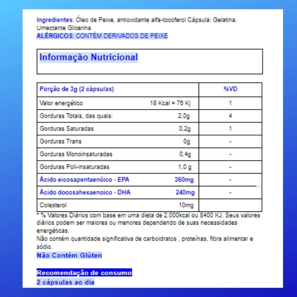 Por cada porção de 2 cápsulas: Ácido elcosapentaenóico - EPA 360 mg; Ácido docosahexaenóico - DHA 240 mg ;