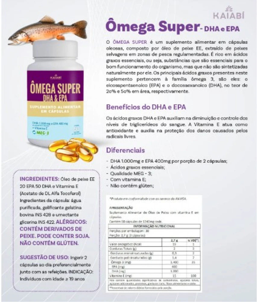 DHA 1000mg e EPA 400mg por porção de 2 cápsulas;