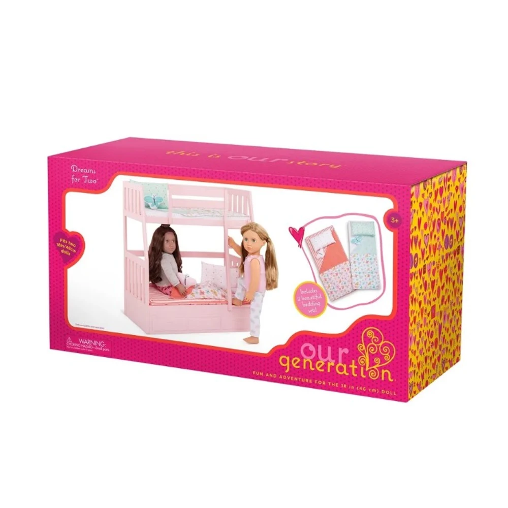 Produto Certificado: 001136/2022Our Generation não é apenas sobre uma boneca ou um livro ou mesmo um fantástico jogo de chá em miniatura. É sobre meninas crescendo juntas, criando a narrativa de uma geração extraordinária. E sobre os pais que entendem as pressões de ser uma garota mais do que qualquer geração de pais anterior à eles. É sobre dar às meninas uma voz para criar e moldar uma comunidade que amam. A linha Our Generation conta com uma linha de acessórios para Bonecas (vendidas separadamente) pensados para transformar a brincadeira em um momento criativo, repleto de expressão. Também contam com uma embalagem reciclável, especialmente desenvolvida para uma geração mais ecológica que não aceitaria nada menos. Our Generation trata-se de uma geração muito importante e sua história! Acompanha além da beliche, a roupa de cama e o travesseiro.