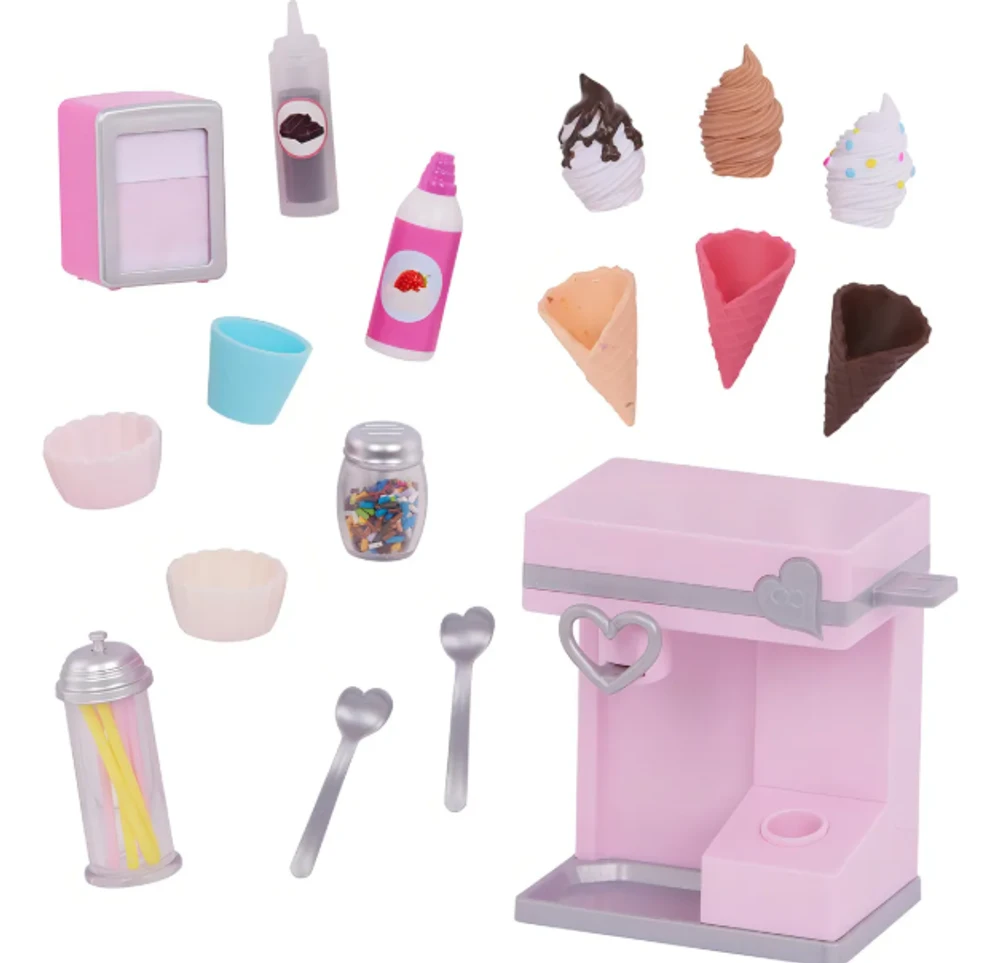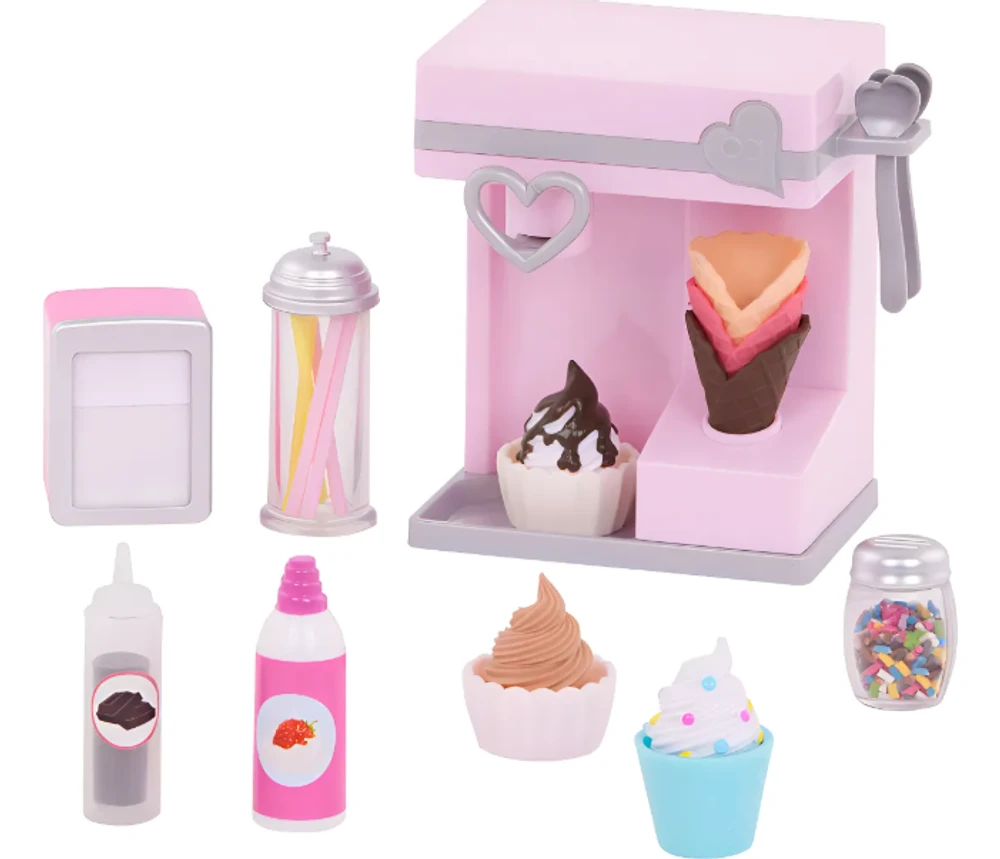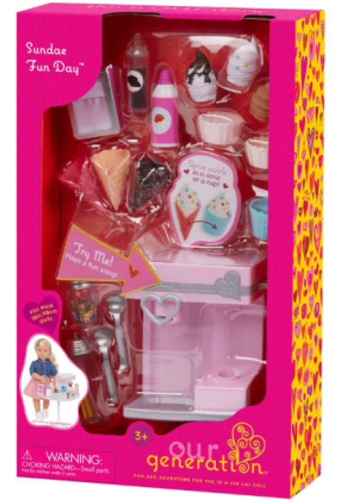 Sirva diversão com o conjunto Our Generation Sundae Fun Day! Esta máquina de sorvete tem tudo o que os amantes de sorvete precisam para criar delícias em miniatura. As crianças podem ativar a alavanca para ouvir sons divertidos enquanto preparam sobremesas imaginárias.
