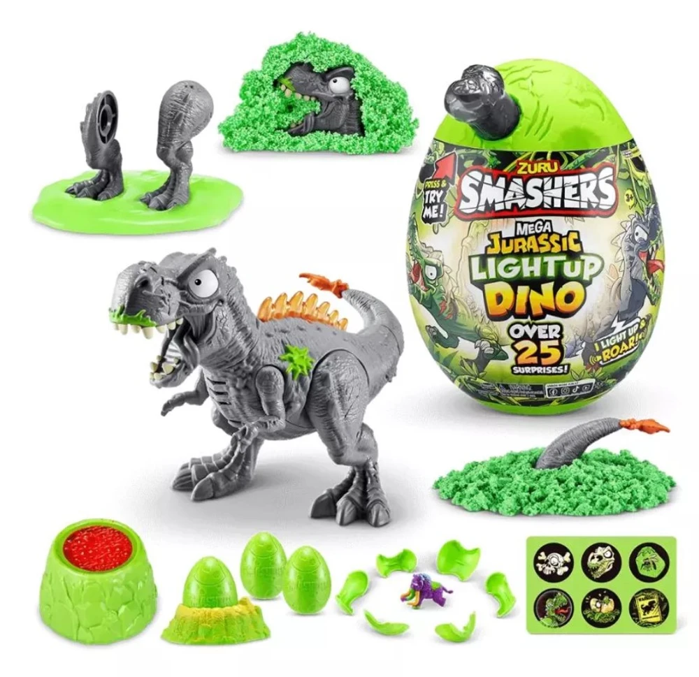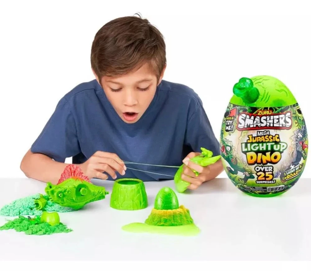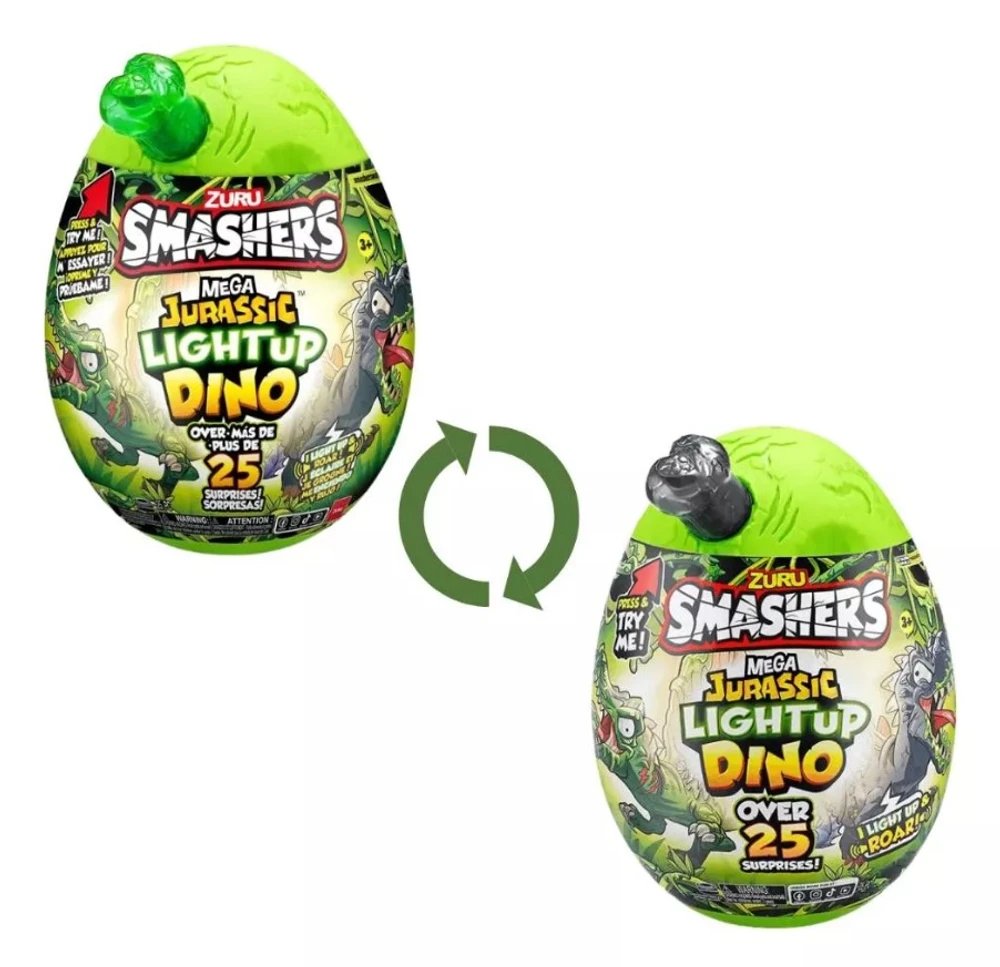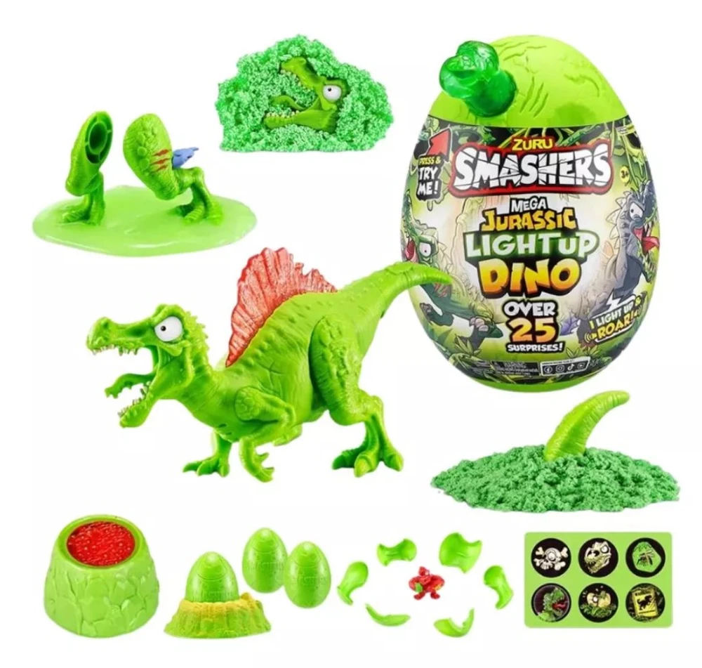 Muitas aventuras com oSmashers Mega Jurassic Light Up Dino! Com este incrível ovo você pode desvendar qual dino vem dentro, além disso, explore um vulcão de lava e descubra4 personagens surpresas!