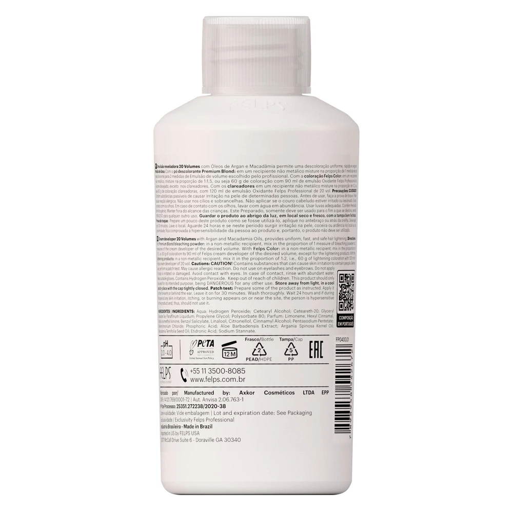 Emulsão Reveladora Felps Color. Produzida exclusivamente para uso profissional. A Emulsão Reveladora complementa o processo de coloração e descoloração e garante um resultado perfeito e uniforme. Contém peróxido de Hidrogênio/Água Oxigenada.