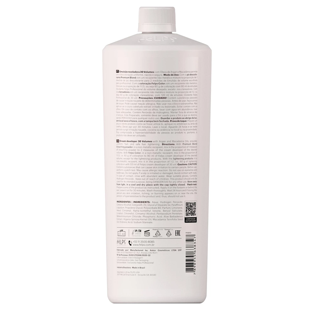 Emulsão Reveladora Felps Color. Produzida exclusivamente para uso profissional. A Emulsão Reveladora complementa o processo de coloração e descoloração e garante um resultado perfeito e uniforme. Contém peróxido de Hidrogênio/Água Oxigenada.