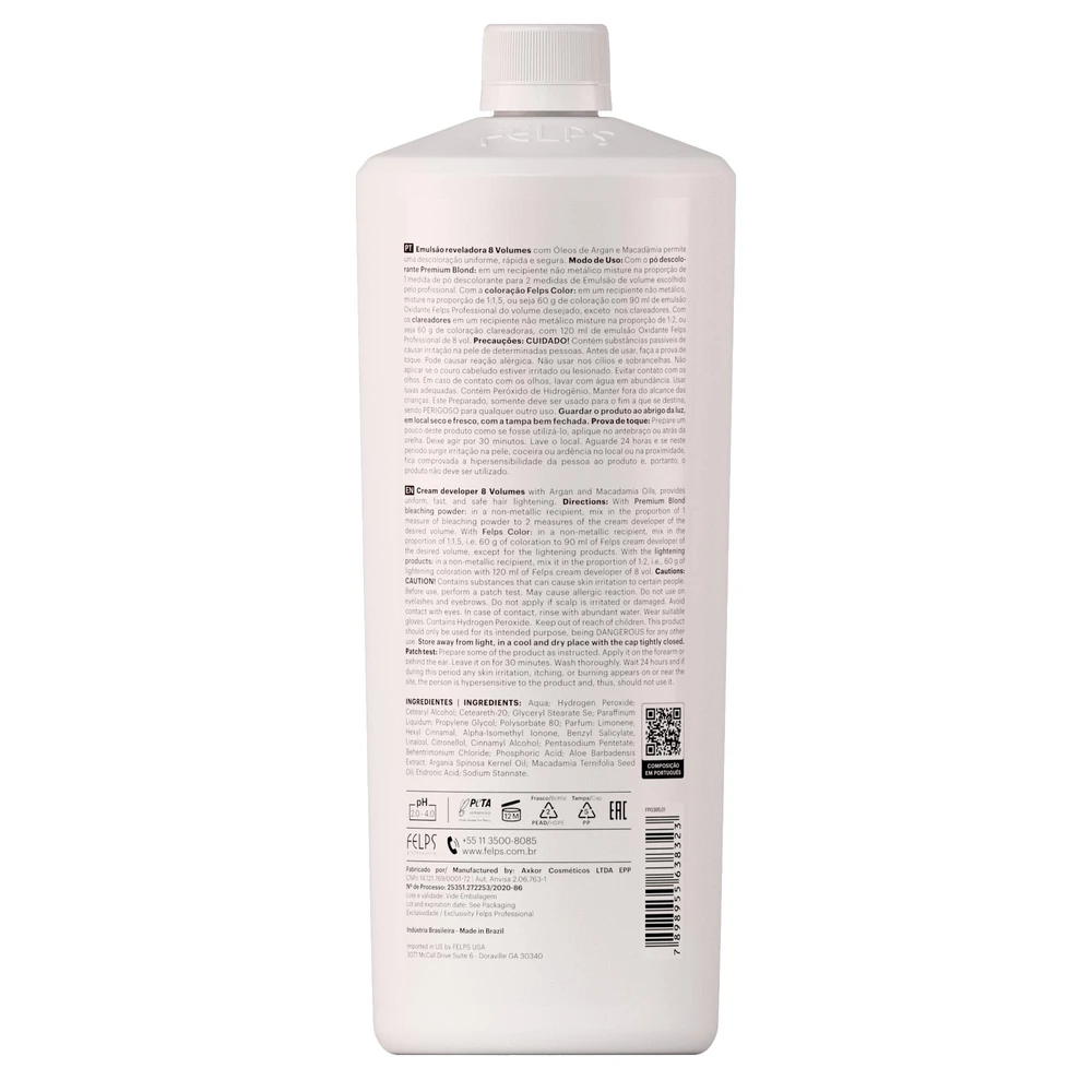 Emulsão Reveladora Felps Color. Produzida exclusivamente para uso profissional. A Emulsão Reveladora complementa o processo de coloração e descoloração e garante um resultado perfeito e uniforme. Contém peróxido de Hidrogênio/Água Oxigenada.