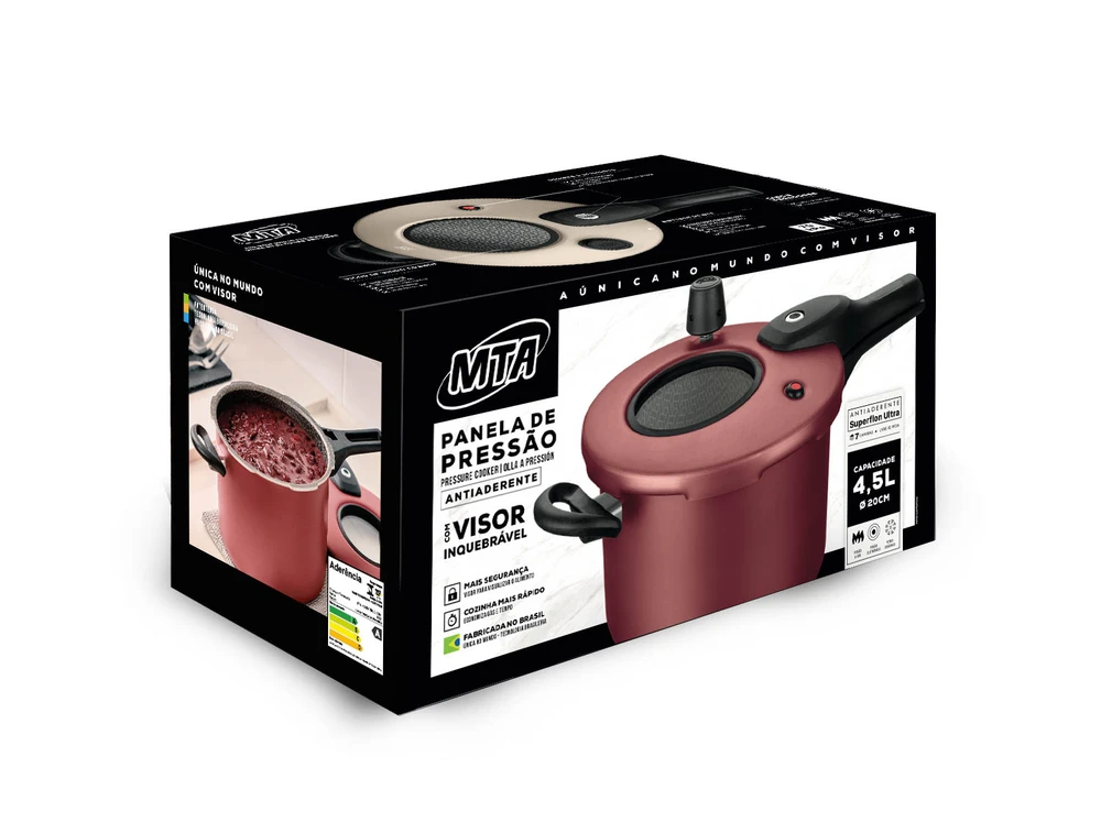 A Panela de Pressão MTA Apossui em suas características Material da tampa: Alumínio e com Visor de Vidro Temperado. Seu pegador é material do pegador possui segurança e resistência. Possui 5 camadas de alta qualidade com fundo e cabos reforçados.