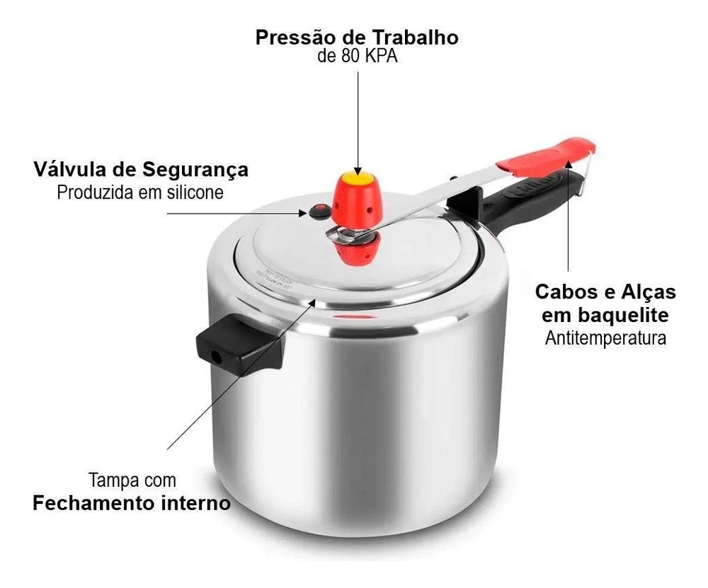 - Borrachas de vedação e válvulas são de silicone que garante uma perfeita vedação mesmo quando submetidas a altas temperaturas em função do cozimento dos alimentos.