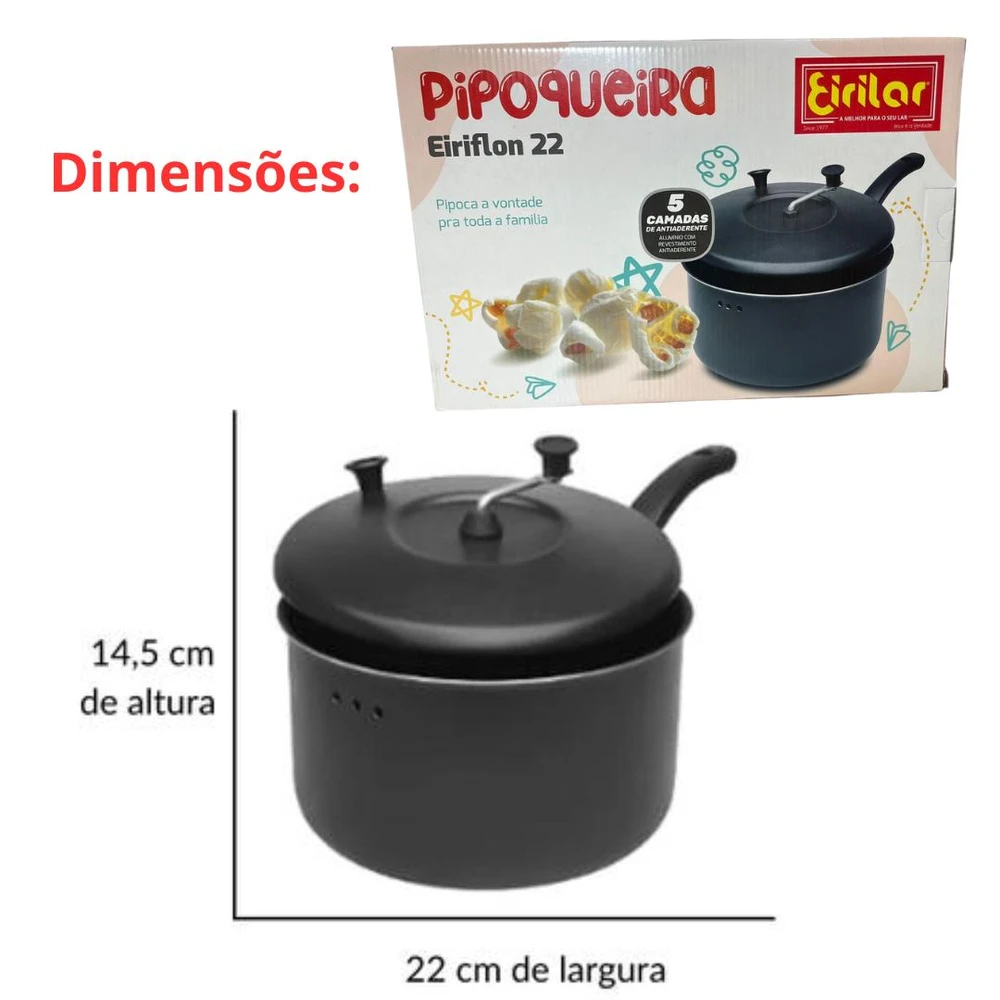 - Medidas: Pipoqueira Antiaderente, medindo 22,00 cm de diâmetro, 14,50 cm de altura e 1,20 mm de espessura