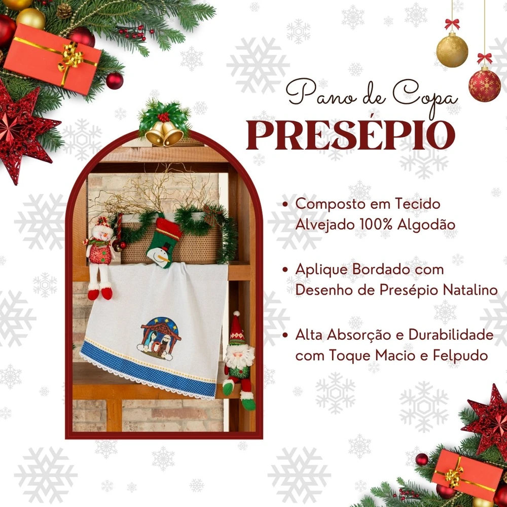 Traga a magia e o calor do Natal para a sua cozinha com este encantador Pano de Copa Presépio Natalino. Este Guardanapo é a união perfeita entre funcionalidade e decoração, ideal para a época mais festiva do ano. O Pano tem um tamanho excelente de 66cm x 45cm, garantindo alta absorção e praticidade no dia a dia. Confeccionado em tecido alvejado 100% algodão, ele possui um toque macio e é extremamente durável. O grande destaque fica por conta do lindo aplique bordado que apresenta o tema de presépio natalino. Além de útil para as tarefas da cozinha, este pano serve como uma charmosa peça de decoração, embelezando o seu ambiente e preparando sua casa para as celebrações. Adquira este kit e celebre o Natal com muito amor e estilo, ou presenteie quem você ama com este item essencial e festivo!