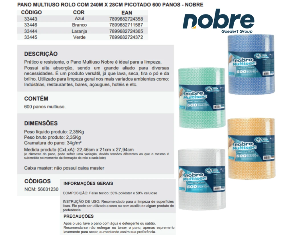 Prático e resistente, o Pano Multiuso Nobre é ideal para a limpeza. Possui alta absorção, sendo um grande aliado para diversas necessidades. É um produto versátil, já que lava, seca, tira o pó e da brilho. Utilizado para limpeza geral nos mais variados ambientes como: Indústrias, restaurantes, bares, açougues, hotéis e etc.