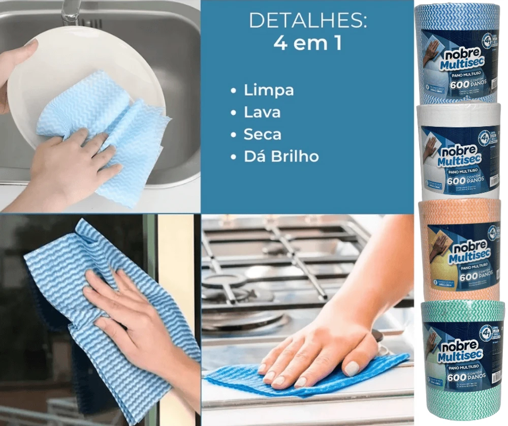 Prático e resistente, o Pano Multiuso Nobre é ideal para a limpeza. Possui alta absorção, sendo um grande aliado para diversas necessidades. É um produto versátil, já que lava, seca, tira o pó e da brilho. Utilizado para limpeza geral nos mais variados ambientes como: Indústrias, restaurantes, bares, açougues, hotéis e etc.
