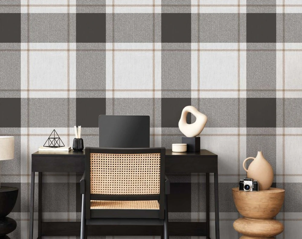 papel de parede Bucalo 38409 xadrez cinza, preto e bege