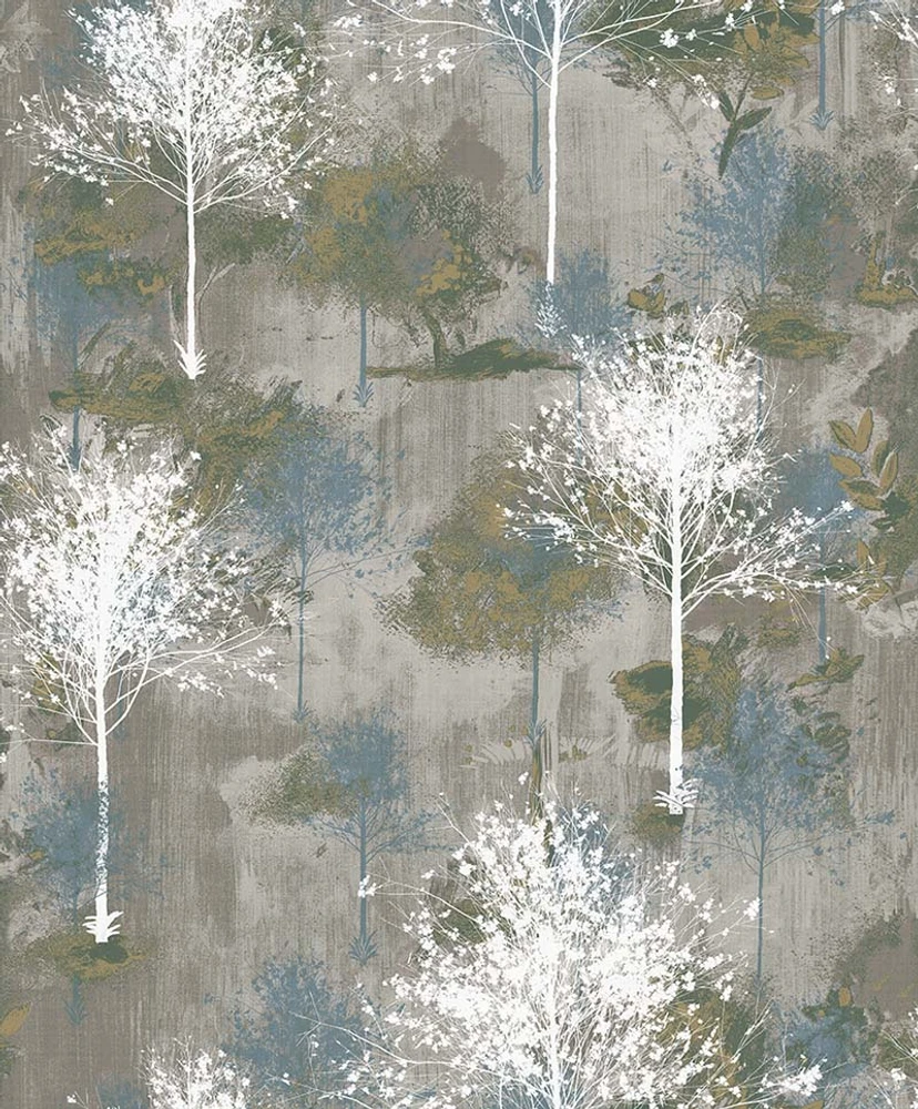 Papel de parede importado TNT galhos - Avalon 115- Antichama nas cores branco, dourado azul e verde- rolo com 10 metros por 53 cm.