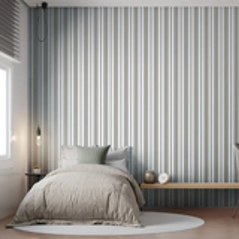 O papel de parede listrado cinza com azul  revoada 4456, é uma excelente escolha para dar aquele charme, elegância e sutileza ao seu ambiente. Material conta com estampa de leve tonalidade o que permite combinação com outros itens de decoração, camada em proteção vinílico que permite limpeza com pano levemente umedecido. rolo vendido na medida de 53 cm de largura por 10 metros de altura/comprimento que cobre aproximadamente 4,20 á 4,50 m² de superfície.