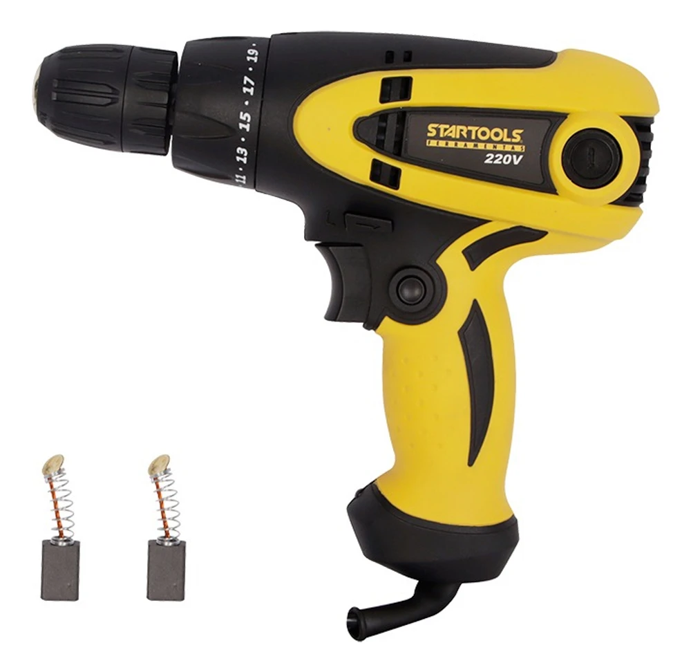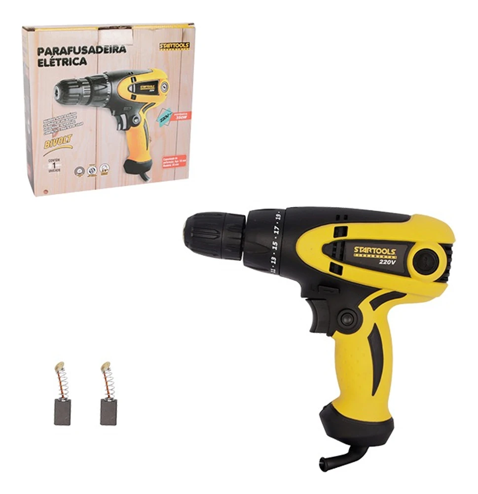 DescriçãoA Parafusadeira eletrica Startools de 350W 220vEsta ferramenta é perfeita para reparos domésticos ou gerais.É compacta e fácil de usar, com ajuste de torque em várias posições, adequando-se à necessidade de aperto de acordo com a dureza do material. O cabo tem revestimento de borracha para maior conforto do operador, além de dupla isolação para maior segurança.É ideal para soltar e apertar parafusos e fazer furos em madeira ou metal.Conteúdo:- 1 Parafusadeira 220V- 1 Chave para MandrilMarca:- StartoolsVoltagem:-220vDetalhes Técnicos:- Impacto: 350W- Tipo de mandril: aperto rápido- Capacidade do Mandril: 3/8? ? 10mm- Frequência: 50Hz / 60Hz- Torque: 10NmMaterial:- Aço, Plástico, Ferro e Borracha