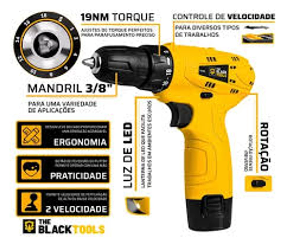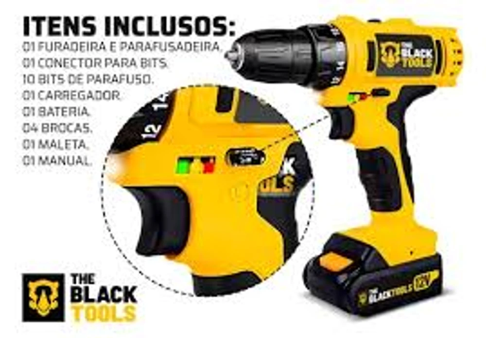 PARAFUSADEIRA / FURADEIRA A BATERIA LITIO TB-12V- 3/8´´/10MM - BIVOLT THE BLACK TOOLS A THE BLACK TOOLS É UMA MARCA COMPROMETIDA COM A QUALIDADE E AS NECESSIDADES DO CLIENTE. COM DESIGN ÚNICO E EXCLUSIVO, É UMA FERRAMENTA COMPACTA E ROBUSTA, IDEAL PARA VOCÊ.NOSSO OBJETIVO É OFERECER AS MELHORES SOLUÇÕES PARA O SEU DIA A DIA, COM UM DESIGN FUNCIONAL E INOVADOR.FURADEIRA PARAFUSADEIRA DE IMPACTO SEM FIO A BATERIA 12V 3/8 10MM COM MALETA E ACESSÓRIOS. VANTAGENS:- BIVOLT, OPERA COM BATERIA RECARREGÁVEL DE TECNOLOGIA LÍTIO (LI-ON), PROPORCIONANDO MAIOR VIDA ÚTIL AO PRODUTO.- AJUSTE DE VELOCIDADE PARA MAIS PRODUTIVIDADE E ECONOMIA DE TEMPO.- LED INDICATIVO DE NÍVEL DA BATERIA, SINALIZANDO O MOMENTO DE RECARREGAR.- LED EMBUTIDO PARA CLAREAR E TER VISIBILIDADE DO LOCAL DE TRABALHO.- CONTROLE ATRAVÉS DO SELETOR DE REVERSO, QUE INVERTE O SENTIDO DE ROTAÇÃO.- SELETOR DE TORQUE DE 18 NÍVEIS PARA PARAFUSAR E 1 NÍVEL PARA PERFURAR, AJUSTANDO PARA OS TIPOS DE TRABALHOS A SEREM REALIZADOS.- PODE SER USADA PARA MATERIAIS COMO: TIJOLOS, MADEIRAS, CERÂMICAS, METAIS, ENTRE OUTROS.- IDEAL PARA PERFURAÇÃO EM DIVERSOS MATERIAIS, COMO METAL, MADEIRA E PLÁSTICO;- PROFISSIONAIS DA CONSTRUÇÃO, MARCENARIA, BRICOLAGEM E USO DOMÉSTICO.