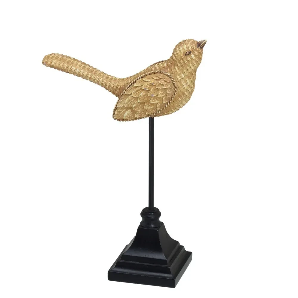 A escultura Pássaro Mabruk em resina e metal na cor dourada adiciona charme e sofisticação a qualquer ambiente, sendo um destaque elegante para sua decoração.