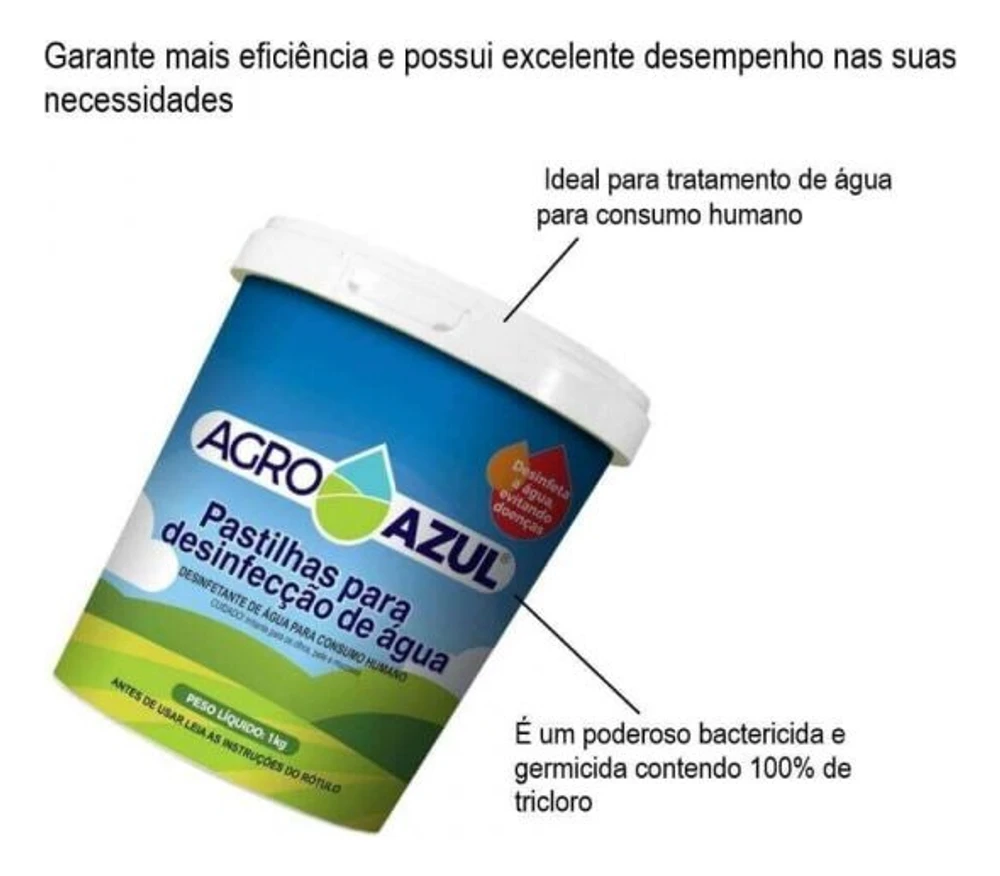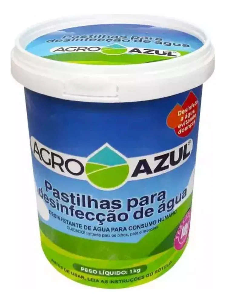 Especificações: Indicado para: Desinfetação da água para consumo humanoTeor de Cloro Ativo: 90%Quantidade da embalagem: 1kgDescrição:A Pastilha AgroAzul é um produto que combate as bactérias e germes, além de desinfetar a água, tornando ela própria para consumo pois não altera o pH da água.Instruções de Uso:Coloque a pastilha nos dosadores de cloro, na entrada da caixa de água, em cada galpão da granja ou na instalação utilizada para distribuição de água.A passagem da água corrente pela Pastilha AgroAzul libera tricloro, que elimina germes e bactérias da água, de modo simples e fácil.DOSAGEM ? Para a água de dessedentação de aves, recomenda-se 2 a 3 ppm de cloro dosado no ponto de consumo (?Nipples? ou bebedouros pendulares).Estudos indicam que, mesmo na superconcentração de 50 ppm de cloro, não se verificaram alterações no peso, na produção de ovos e no consumo de ração. Em frangos de corte, nos mesmos níveis, constatou-se a redução no consumo de água, mas sem afetar a conversão alimentar.Substância Química: Tricloro S-Triazina-Triona.