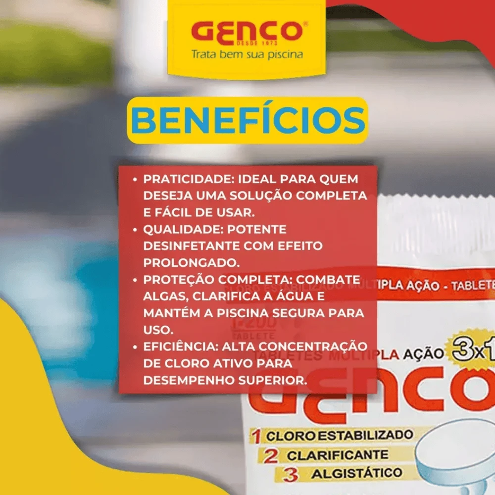Produto concentrado, contém 85% de cloro ativo. Possui estabilizante que inibe a degradação do cloro pelos raios UV (raios solares). GENCO® TABLETES MÚLTIPLA AÇÃO "3 em 1" apresenta dissolução lenta para cloração contínua e automática. Sua fórmula múltipla ação é recomendada especialmente para quem quer praticidade aliada à qualidade. Poderoso desinfetante (cloro com estabilizante), clarificante, algicida e algistático. Indicado para piscinas residenciais.