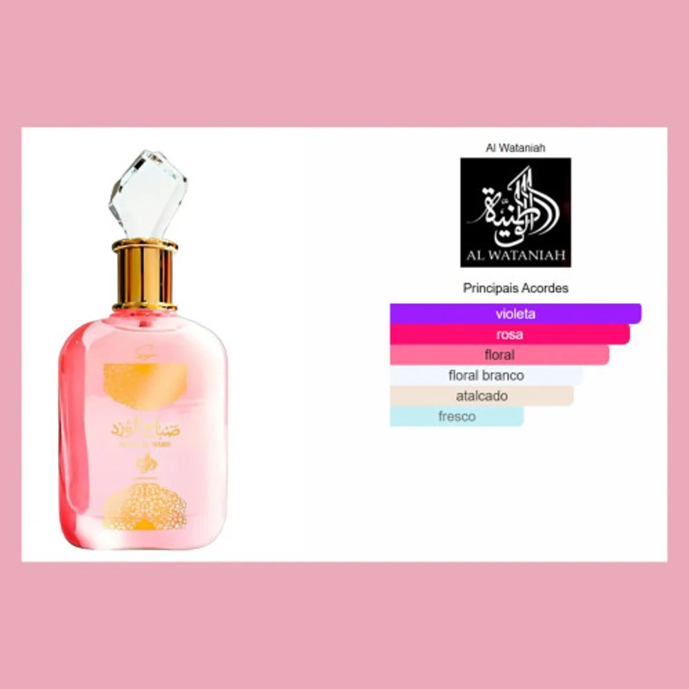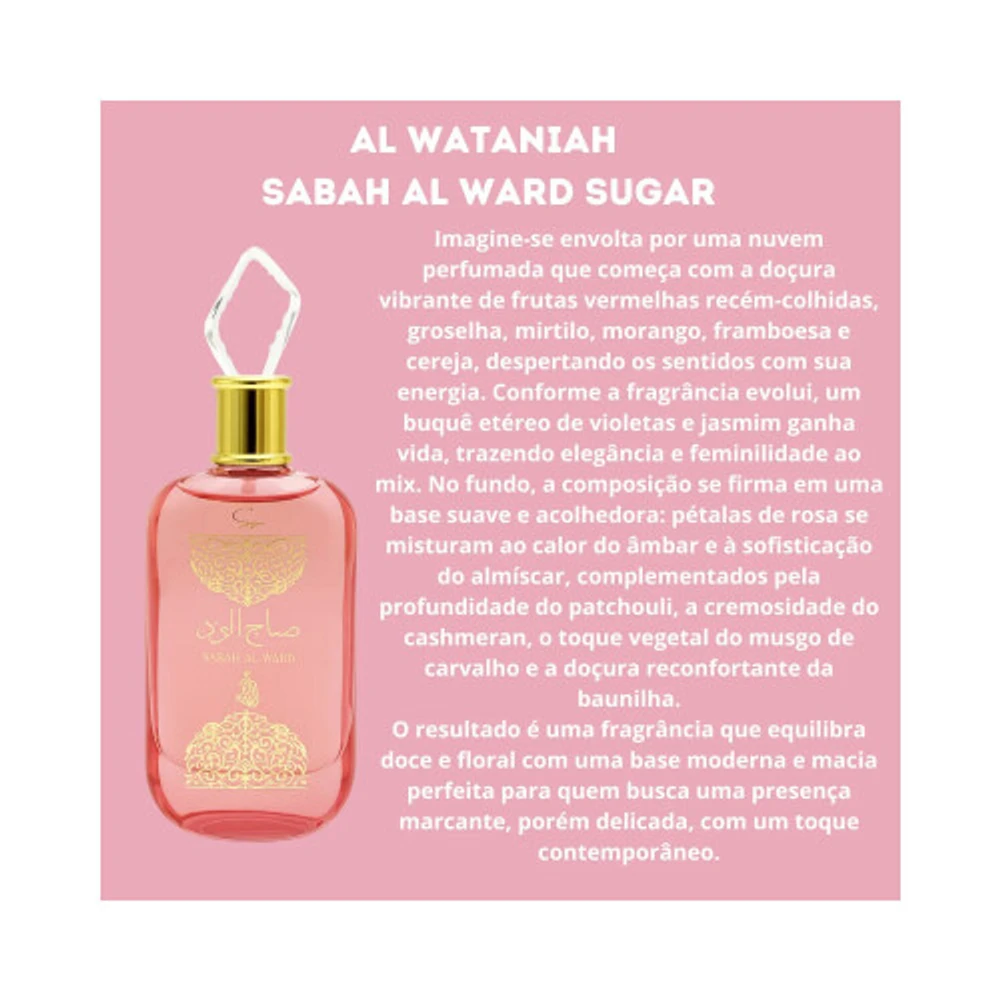 O Al Wataniah Sabah Al Ward Eau de Parfum é uma fragrância feminina encantadora e sofisticada, perfeita para mulheres que buscam um aroma floral delicado e envolvente.Inspirado na beleza e frescor das flores ao amanhecer, esse perfume combina notas frutadas vibrantes com um buquê floral elegante e toques amadeirados suaves.Com excelente fixação, Sabah Al Ward é ideal para uso diário e ocasiões especiais, deixando um rastro romântico e marcante por onde passa.Ocasião: Uso Diário, Trabalho, Encontros RomânticosFamília Olfativa: Floral Frutado Notas de Topo: Frutas Vermelhas, CítricosNotas de Coração: Rosa, Jasmim, Flor de LaranjeiraNotas de Fundo: Almíscar, Âmbar, BaunilhaBenefícios do Produto:Eficácia: Fragrância delicada e sofisticada, perfeita para mulheres que apreciam perfumes florais encantadores. Durabilidade: Excelente fixação e projeção equilibrada, ideal para o dia a dia e momentos especiais.Versatilidade: Aroma versátil, adequado para todas as ocasiões, do cotidiano a eventos elegantes.Design ou Praticidade: Frasco elegante que reflete a feminilidade e a sofisticação da fragrância.