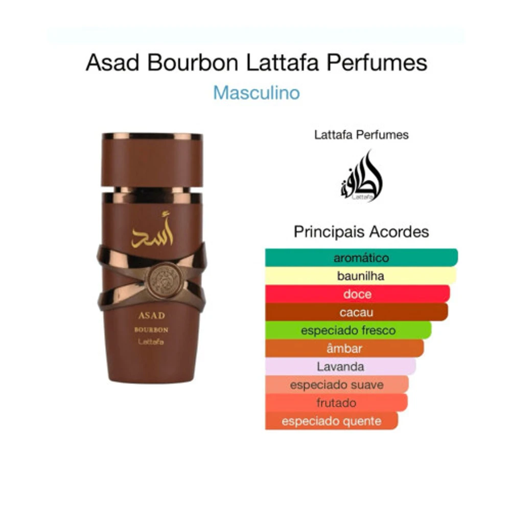 Asad Bourbon Lattafa Perfumes Eau de ParfumAsad Bourbon é um perfume importado Lattafa Perfumes masculino oriental especiado. Com fragrância sofisticada, perfeita para quem busca um perfume marcante e duradouro.O Perfume Asad Bourbon, de Lattafa Perfumes, exala masculinidade e ousadia. Apresenta notas doces de coco, baunilha e flor de laranjeira que se entrelaçam com uma base amadeirada e quente, criando uma fragrância sofisticada, perfeita para ocasiões especiais. Um perfume marcante e duradouro, que traduz a força e a imponência do ?Leão?, como o nome ?Asad? significa em árabe.