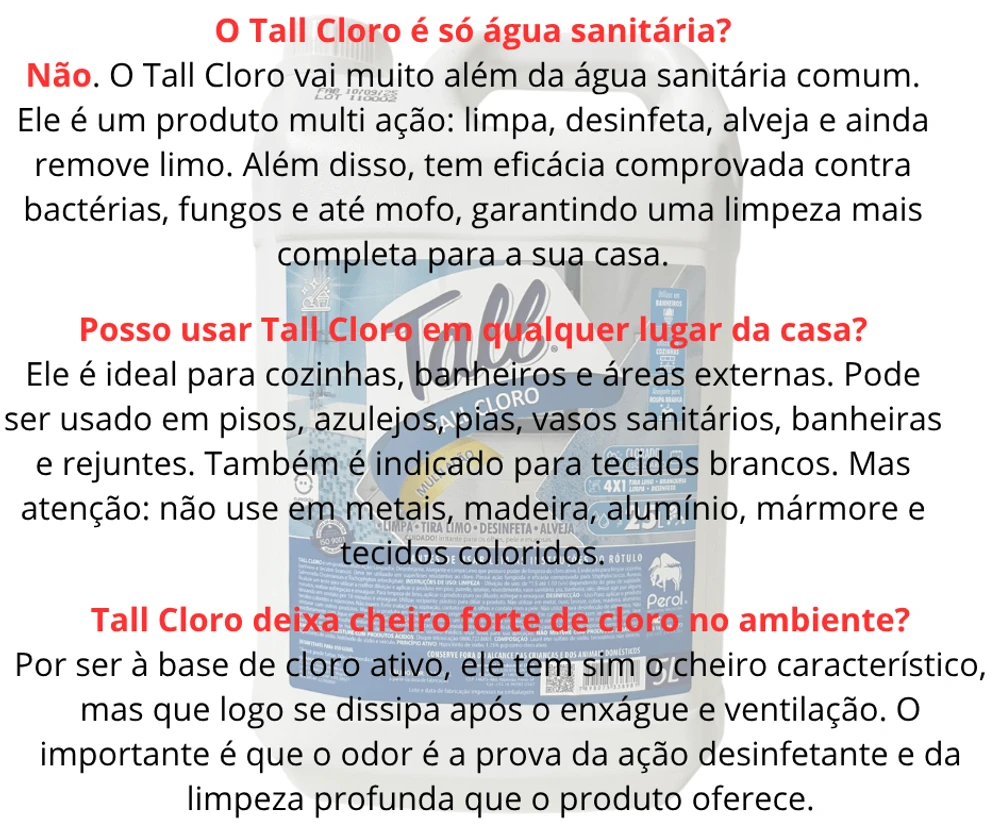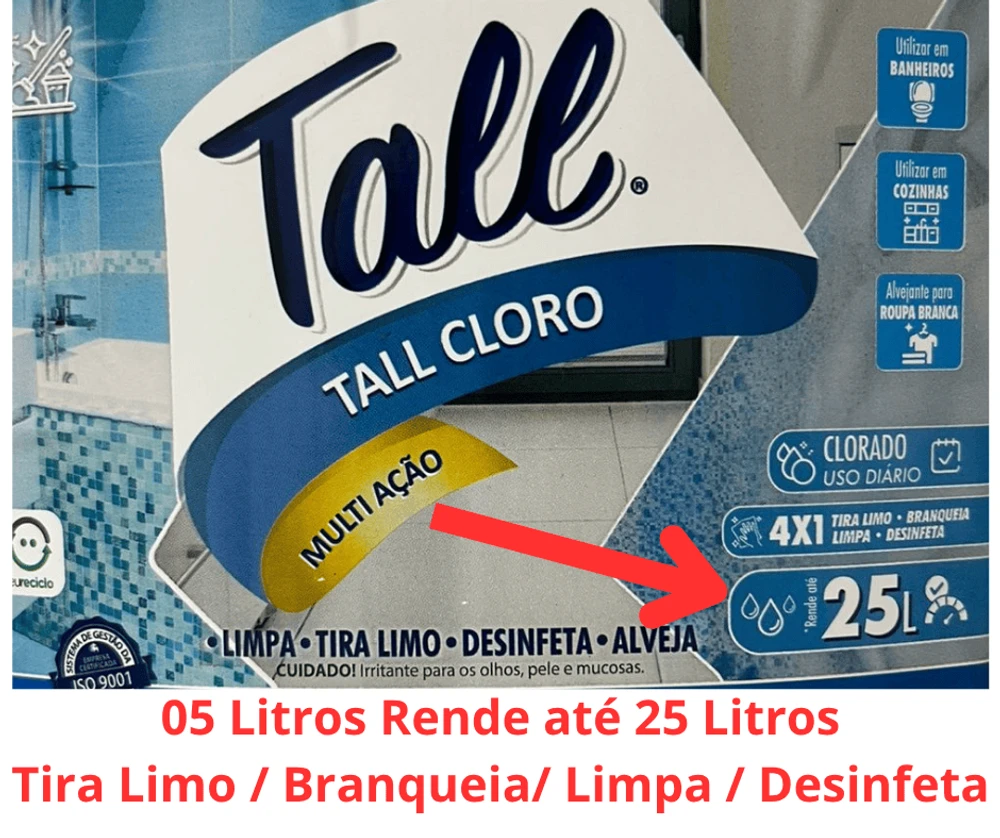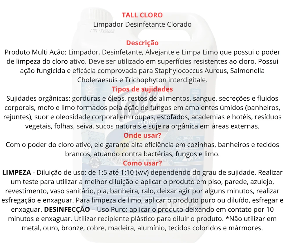 Produto Multi Ação: Limpador, Desinfetante, Alvejante e Limpa Limo que possui o poder de limpeza do cloro ativo. Deve ser utilizado em superfícies resistentes ao cloro. Possui ação fungicida e eficácia comprovada para Staphylococcus Aureus, Salmonella Choleraesuis e Trichophyton interdigitale.