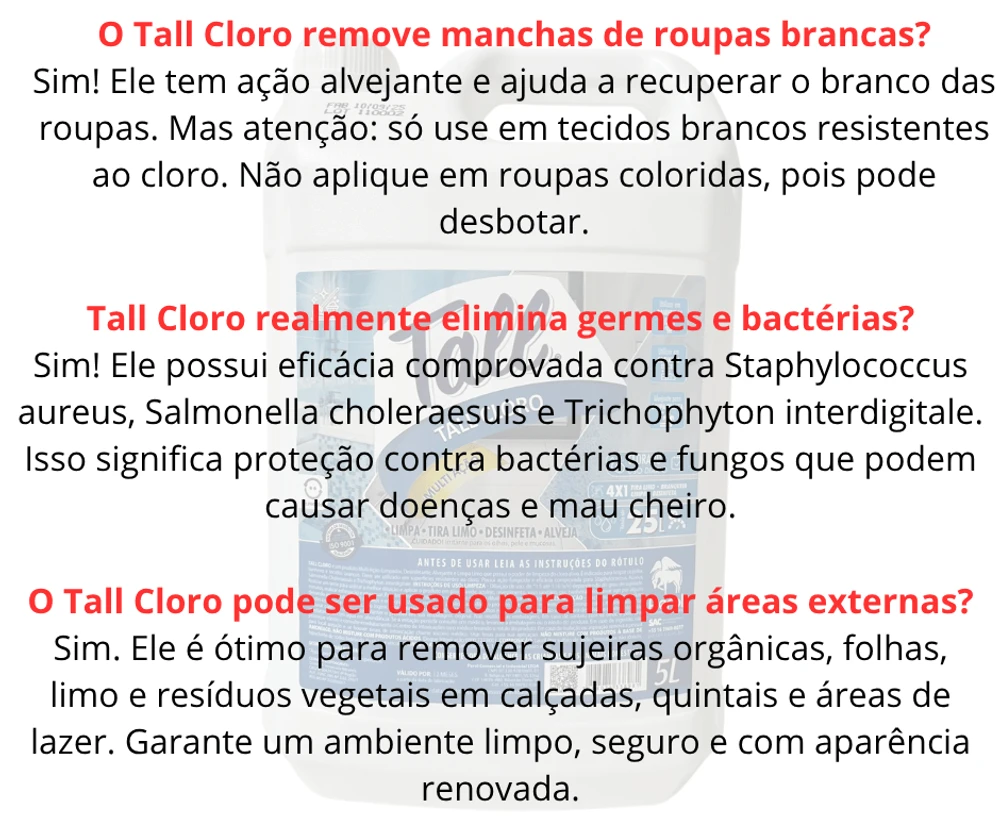 Com o poder do cloro ativo, ele garante alta eficiência em cozinhas, banheiros e tecidos brancos, atuando contra bactérias, fungos e limo.