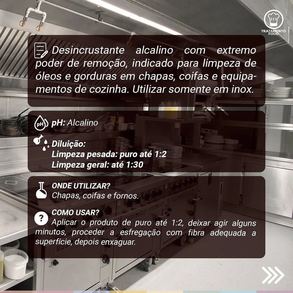 Desincrustante desenvolvido para remover sujeiras pesadas, como gorduras carbonizadas em fogões, chapas, coifas e equipamentos de cozinha.