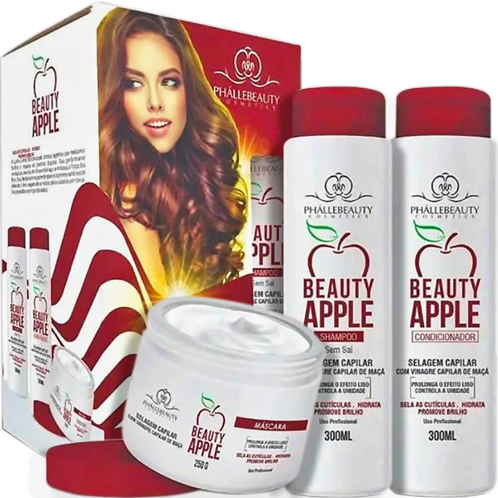 A linha Beauty Apple Phállebeauty foi especialmente desenvolvida para selar as cutículas e garantir que todos os nutrientes e vitaminas que o cabelo precisa vão ficar dentro dele. A linha é rica em agentes hidratantes e antioxidantes naturais que confere textura suave, redução do aspecto poroso e promove brilho reflexivo aos fios opacos e saturados.