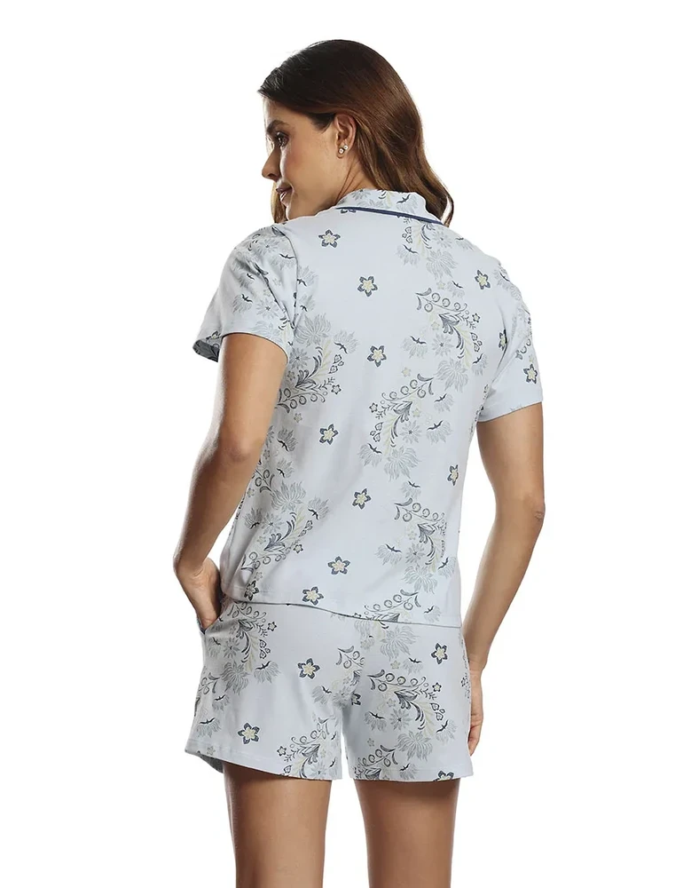 O pijama curto americano Flora Paulienne combina conforto, estilo e praticidade em uma peça leve e versátil. Confeccionado em malha de algodão, apresenta blusa de manga curta, toda aberta na frente com abotoamento e contorno em viés, gola com desenho exclusivo e decote em V. O short possui detalhe em viés nas pernas, completando o conjunto com harmonia. A estampa corrida combinando com o viés proporciona um visual moderno e elegante, ideal para momentos de descanso ou uso em casa.