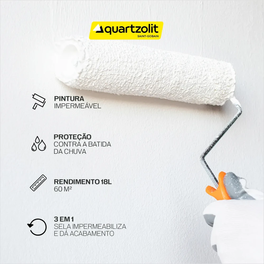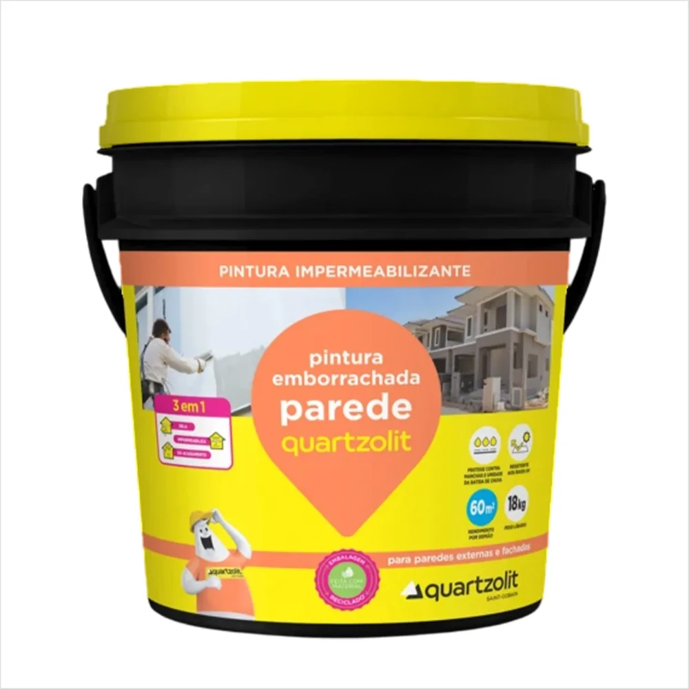 Impermeabilizante Pintura Emborrachada Parede Quartzolit Impermeabilizante à base de resina acrílica, com propriedades elásticas, desenvolvido para a proteção de superfícies externa pintura emborrachada parede quartzolit é um impermeabilizante para paredes, indicado para a proteção de fachadas, paredes externas e muros. Possui tecnologia 3 em 1: sela, impermeabiliza e dá acabamento. Quando curada, forma uma membrana elástica e impermeável. Desenvolvido para a proteção de superfícies externas submetidas a intempéries como chuva e ação direta do sol. • Pronta para uso e de fácil aplicação • Protege contra manchas e a umidade da batida de chuva • Resistente aos raios UV