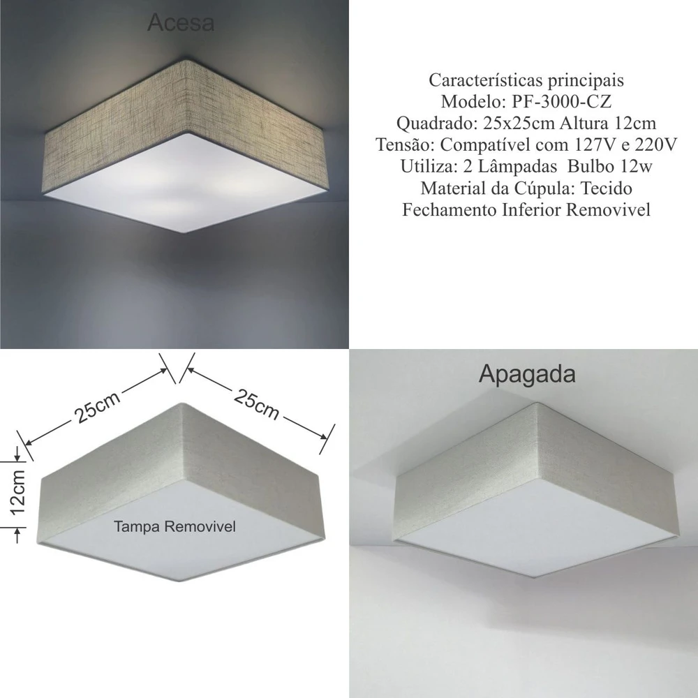 Descubra o Plafon Quadrado MD-3000 com cúpula em tecido, ideal para quem busca iluminação sofisticada e aconchegante. Com medidas de 25x25x12 cm, seu design compacto e neutro se integra facilmente a diversos estilos de decoração, valorizando ambientes residenciais e comerciais. Sua estrutura bivolt suporta até 2 lâmpadas LED de 12W (não inclusas), proporcionando economia e iluminação eficiente. A cúpula em tecido garante uma luz difusa, confortável para salas, quartos e escritórios, criando um clima acolhedor. Invista em um plafon que alia funcionalidade, durabilidade e estética para transformar a iluminação com um toque de elegância natural.