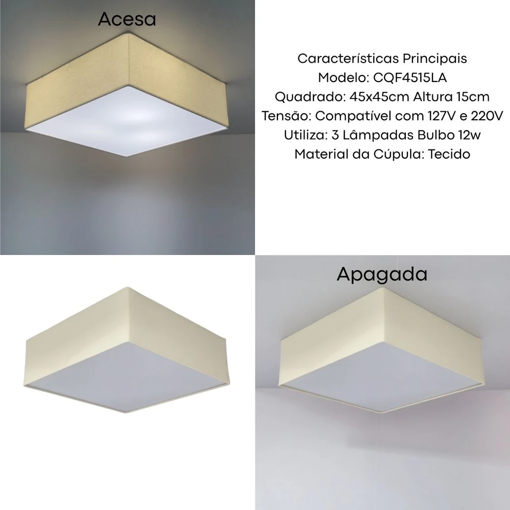 Ideal para quem busca iluminação sofisticada e aconchegante. Com medidas de 45x45x15 cm, seu design compacto e neutro se integra facilmente a diversos estilos de decoração, valorizando ambientes residenciais e comerciais. Sua estrutura bivolt suporta até 3 lâmpadas LED de 12W (não inclusas), proporcionando economia e iluminação eficiente. A cúpula em tecido garante uma luz difusa, confortável para salas, quartos e escritórios, criando um clima acolhedor. Invista em um plafon que alia funcionalidade, durabilidade e estética para transformar a iluminação com um toque de elegância natural.