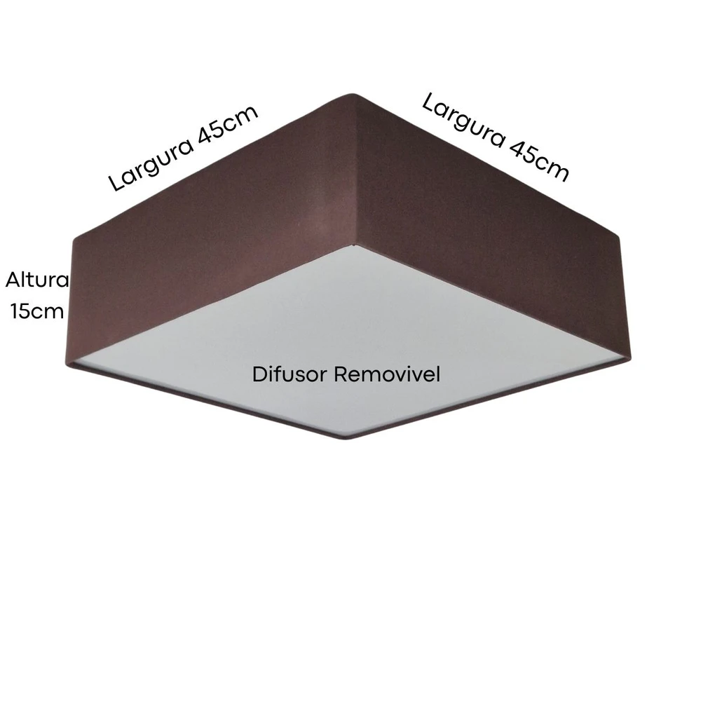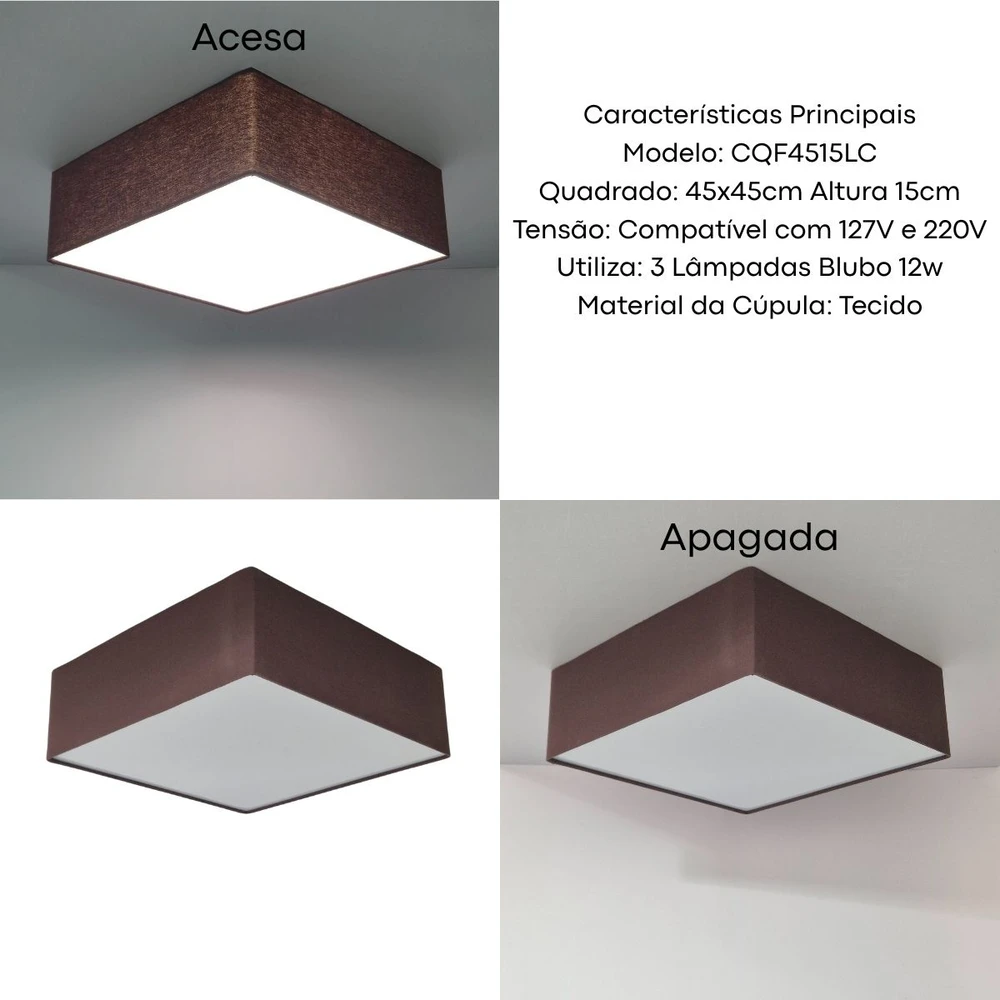 Ideal para quem busca iluminação sofisticada e aconchegante. Com medidas de 45x45x15 cm, seu design compacto e neutro se integra facilmente a diversos estilos de decoração, valorizando ambientes residenciais e comerciais. Sua estrutura bivolt suporta até 3 lâmpadas LED de 12W (não inclusas), proporcionando economia e iluminação eficiente. A cúpula em tecido garante uma luz difusa, confortável para salas, quartos e escritórios, criando um clima acolhedor. Invista em um plafon que alia funcionalidade, durabilidade e estética para transformar a iluminação com um toque de elegância natural.