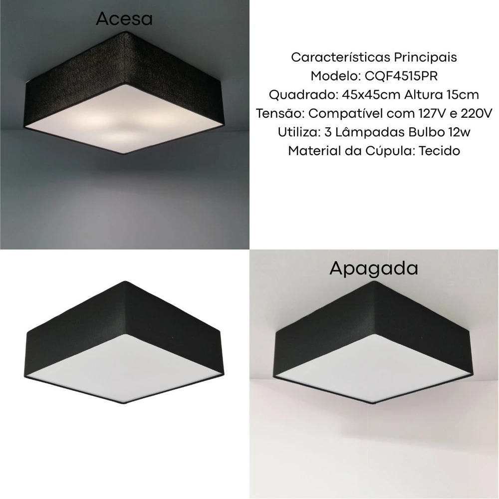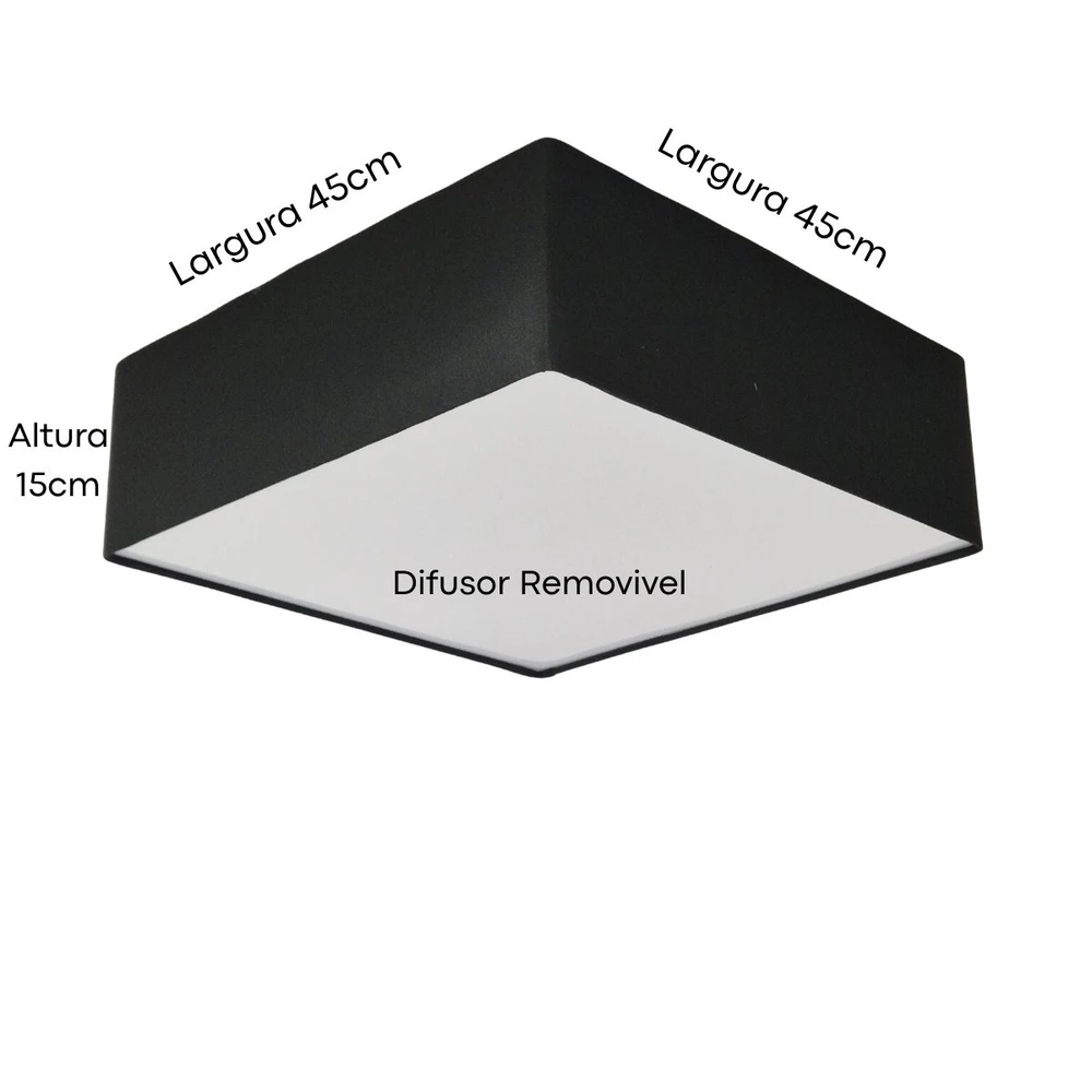 Ideal para quem busca iluminação sofisticada e aconchegante. Com medidas de 45x45x15 cm, seu design compacto e neutro se integra facilmente a diversos estilos de decoração, valorizando ambientes residenciais e comerciais. Sua estrutura bivolt suporta até 3 lâmpadas LED de 12W (não inclusas), proporcionando economia e iluminação eficiente. A cúpula em tecido garante uma luz difusa, confortável para salas, quartos e escritórios, criando um clima acolhedor. Invista em um plafon que alia funcionalidade, durabilidade e estética para transformar a iluminação com um toque de elegância natural.