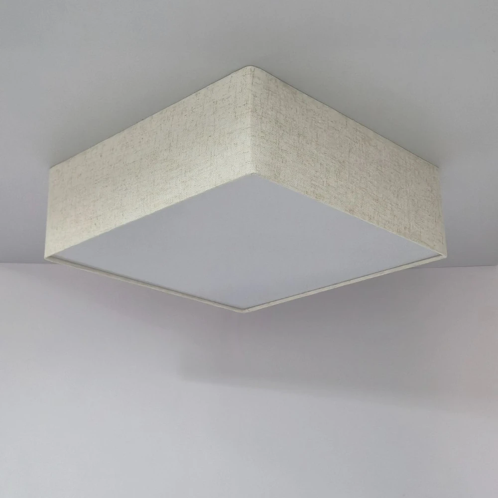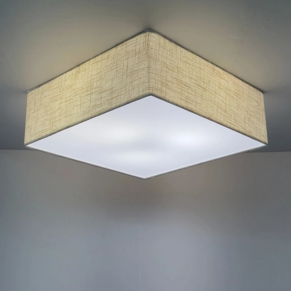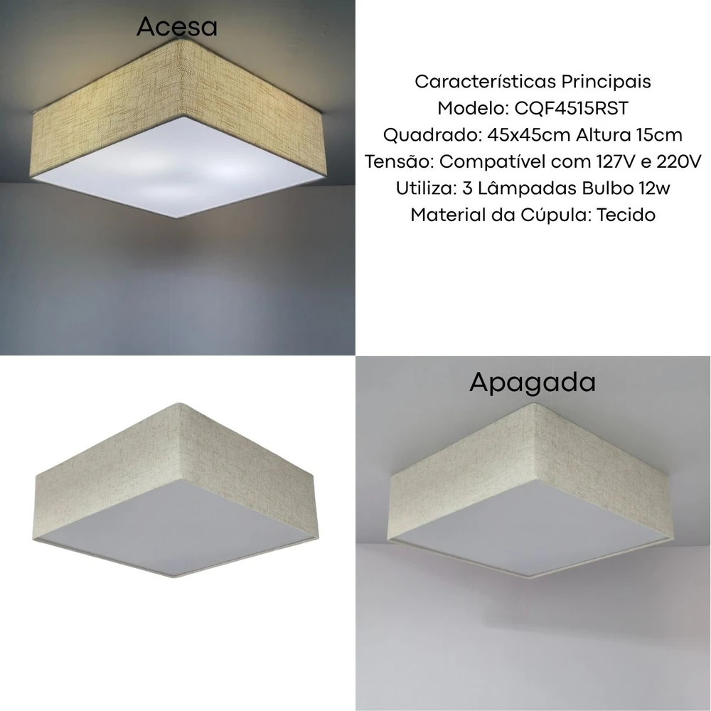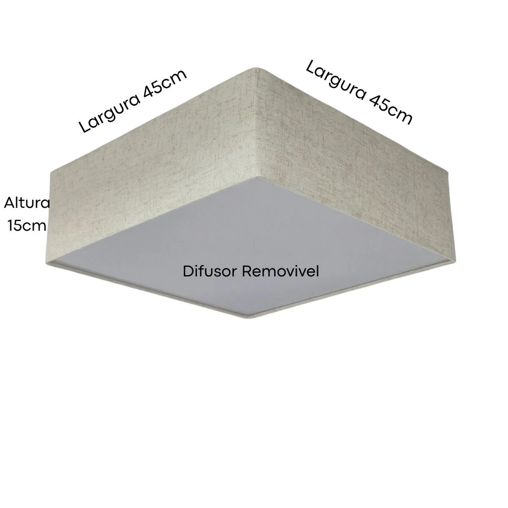 Ideal para quem busca iluminação sofisticada e aconchegante. Com medidas de 45x45x15 cm, seu design compacto e neutro se integra facilmente a diversos estilos de decoração, valorizando ambientes residenciais e comerciais. Sua estrutura bivolt suporta até 3 lâmpadas LED de 12W (não inclusas), proporcionando economia e iluminação eficiente. A cúpula em tecido garante uma luz difusa, confortável para salas, quartos e escritórios, criando um clima acolhedor. Invista em um plafon que alia funcionalidade, durabilidade e estética para transformar a iluminação com um toque de elegância natural.