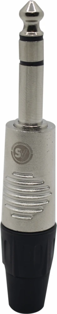 Plugue TRS (tip-ring-sleeve) de 6,3 mm (¼") metálico, ideal para conexões balanceadas, fones de ouvido ou sinais estéreo.