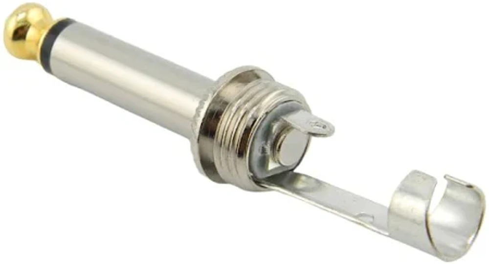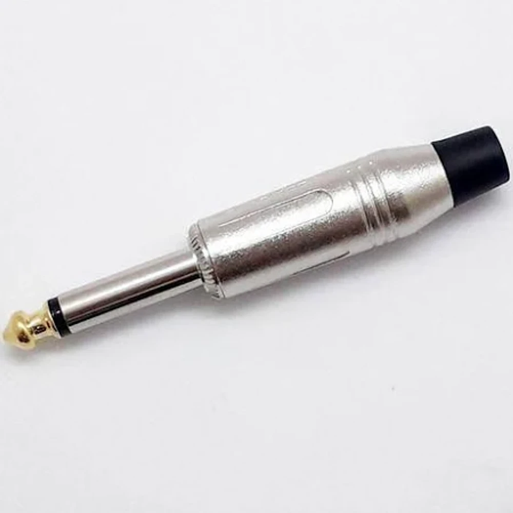 Conector P10 Mono (1/4") com corpo de metal resistente e acabamento niquelado, projetado para uso profissional em instrumentos ou sistemas de áudio.