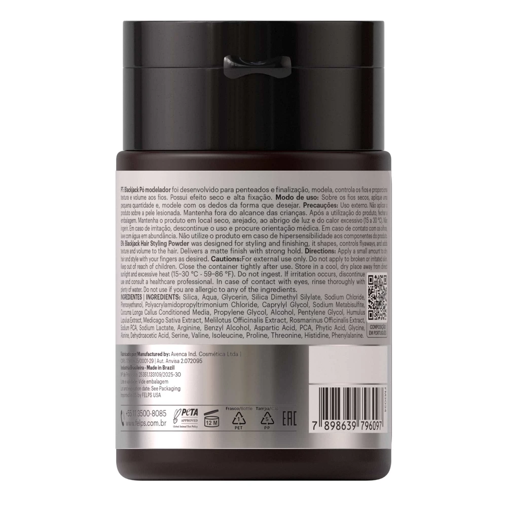 Pó modelador Black Jack modela e controla os fios, proporcionando maior flexibilidade, textura e volume ao cabelo. Possui efeito seco, deixando o cabelo com aspecto natural.