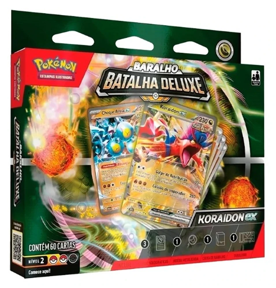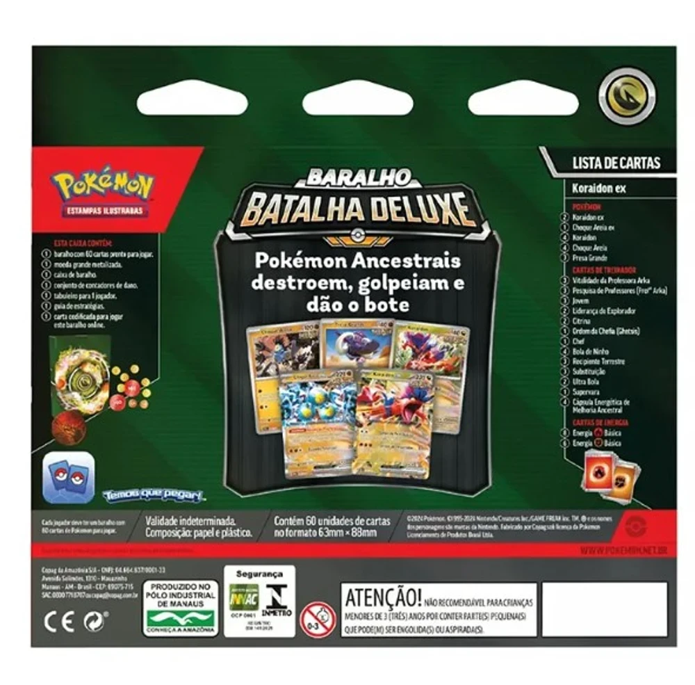 Pokémon Box Batalha Deluxe Koraidon. O deck inclui uma variedade de outro Pokémon, cartas de Treinador e cartas de Energia para fornecer uma experiência de jogo equilibrada e competitiva.