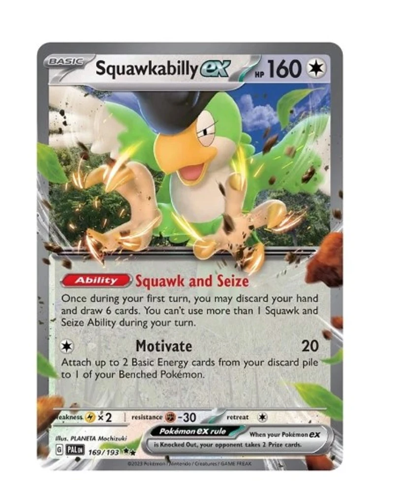 - 56 cartas para fortalecer os seus baralhos, incluindo: dezenas de cartas de treinador, 4 cartas de energia especial, 6 cartas de pokémon, incluindo 2 cartas de squawkabillly ex;