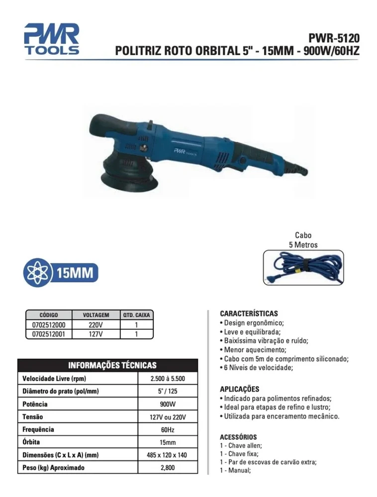 Se você trabalha com estética automotiva, funilaria ou restauração e sente que os resultados ficam aquém do esperado por vibração, esforço excessivo ou baixa capacidade de corte, a PWR 5120 resolve Tudo isso ela oferece potência consistente de 900 W, órbita generosa de 15 mm e controle de velocidade para adaptar cada etapa (refino, lustro, enceramento). O corpo ergonômico, cabo longo siliconado e baixo ruído melhoram o conforto em sessões prolongadas de uso profissional.