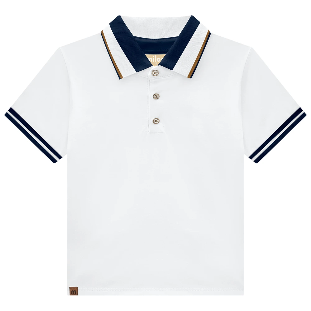 Excelente escolha para o conforto e estilo do seu filho, feita com algodão de alta qualidade que oferece toque macio. Seu design clássico, com gola e punhos listrados em azul marinho e detalhes em caramelo, confere um visual moderno e sofisticado, ideal para ocasiões casuais e eventos especiais. Os três botões frontais facilitam o vestir e garantem mais elegânicia para os pequenos. A meia malha proporciona durabilidade e resistência, mantendo a peça impecável mesmo após várias lavagens.